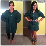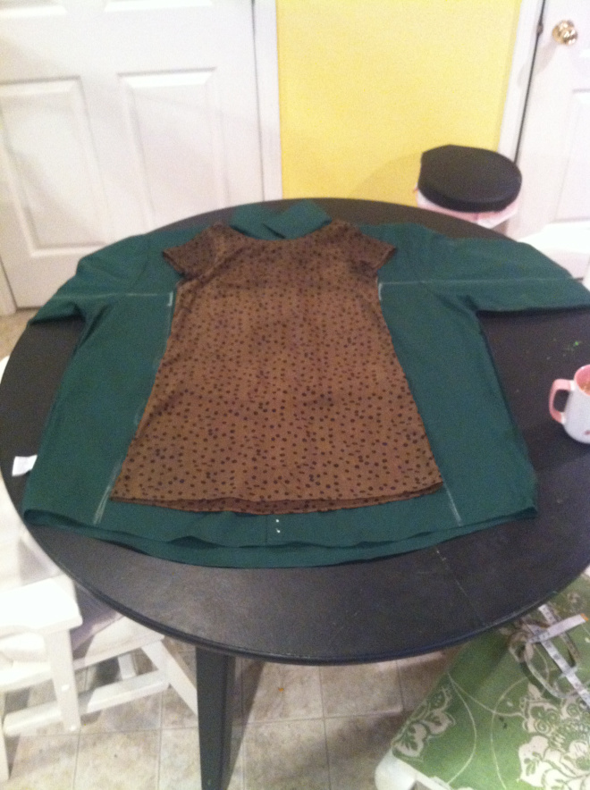 The color is off in the pictures, but it’s a gorgeous emerald. Green is my favorite color and it works well with a lot of my fall wardrobe. First, I took a tunic dress that fits me well and laid it flat on the inside-out shirt.