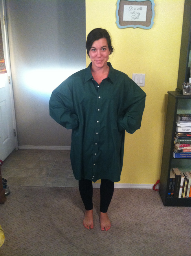My goal tonight is to prove to the world that anyone can refashion. If you have a sewing machine and an hour you’ve got this in the bag. Tonight is simple, but it goes to show a little tweaking can go a long way. I’m about to look way too excited in an oversized men’s dress shirt. You ready? Bam!