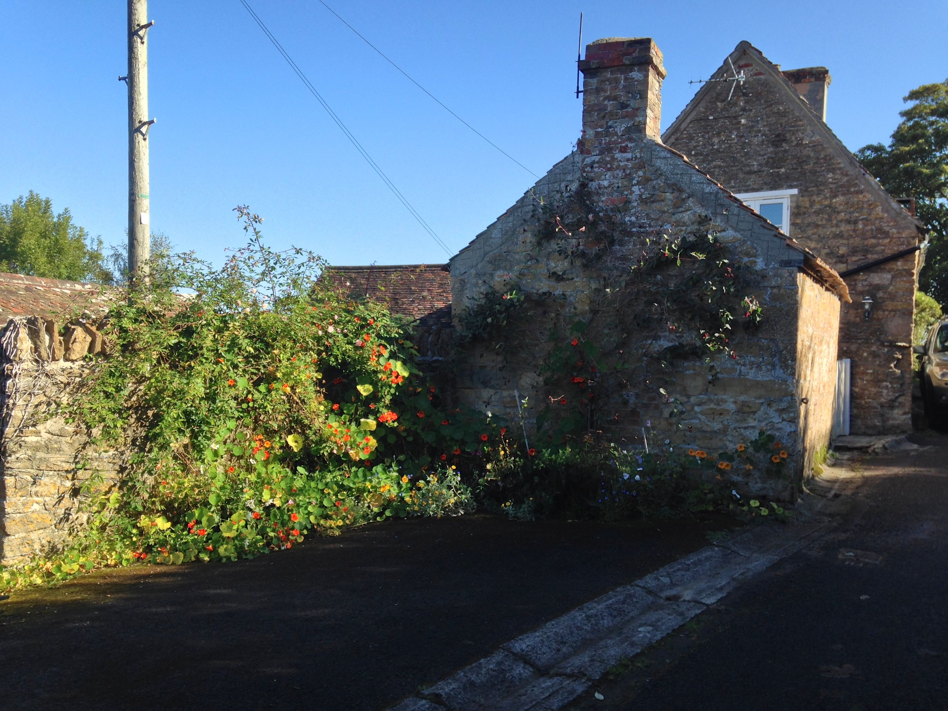 Back onto the lane and a pretty little corner in Maperton (population 100) caught my eye. I usually walk straight past but I thought I’d photograph it today to show you; the shady end of the cottage has been planted with vibrant orange flowers which smell heavenly as you drift by.