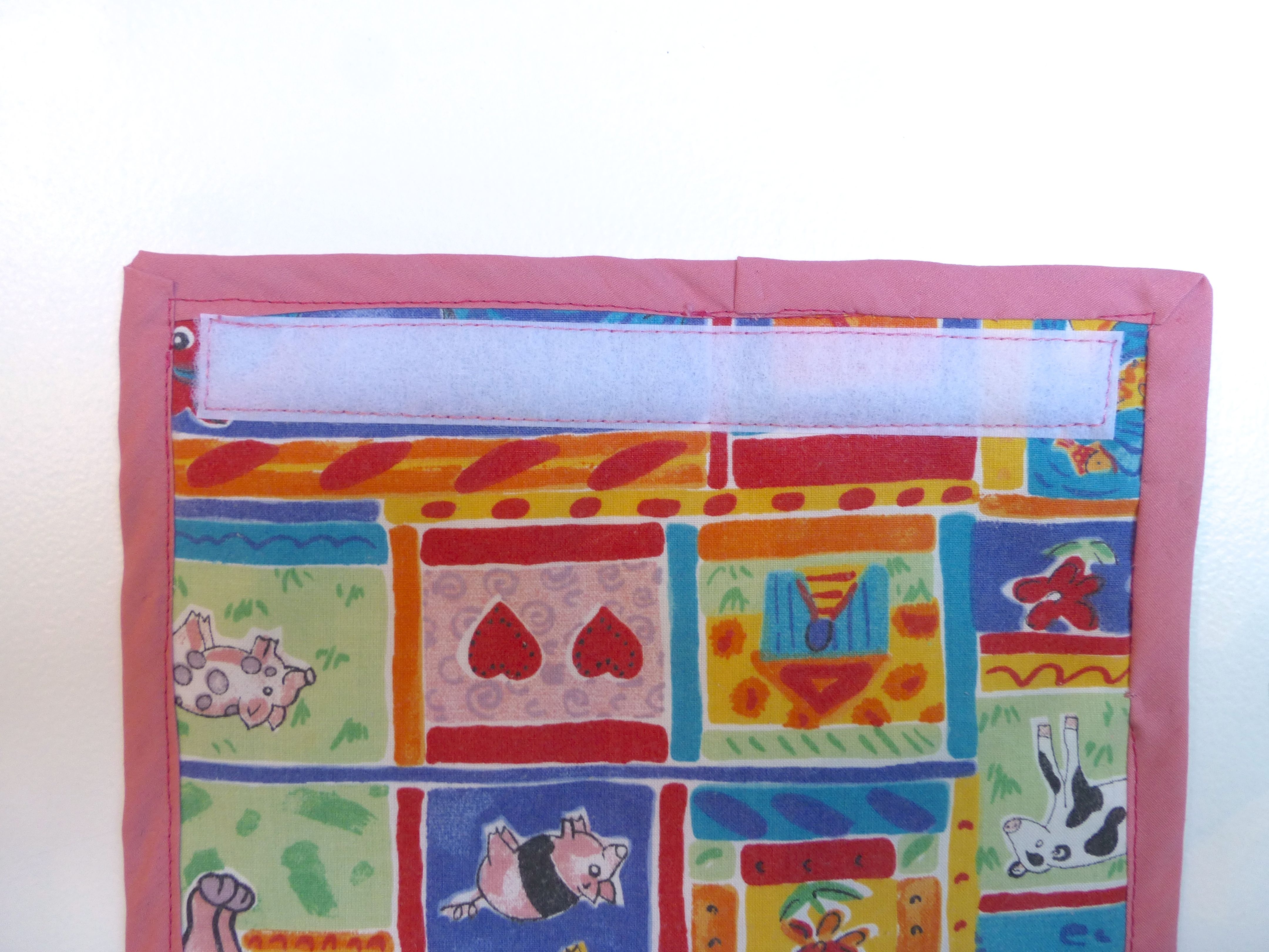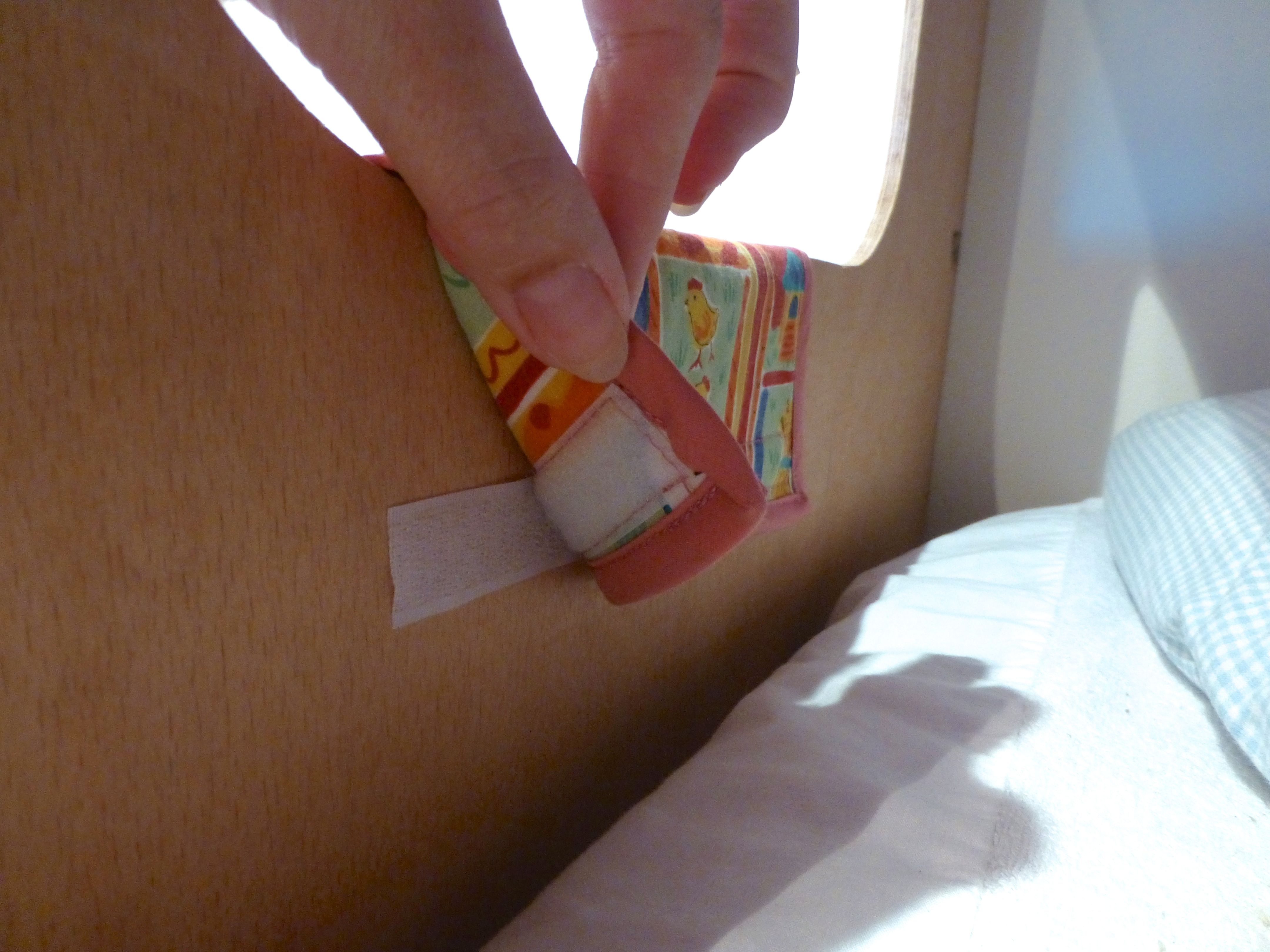 8. Stick the adhesive part to the inside of your bed frame and attach your finished pocket to it.