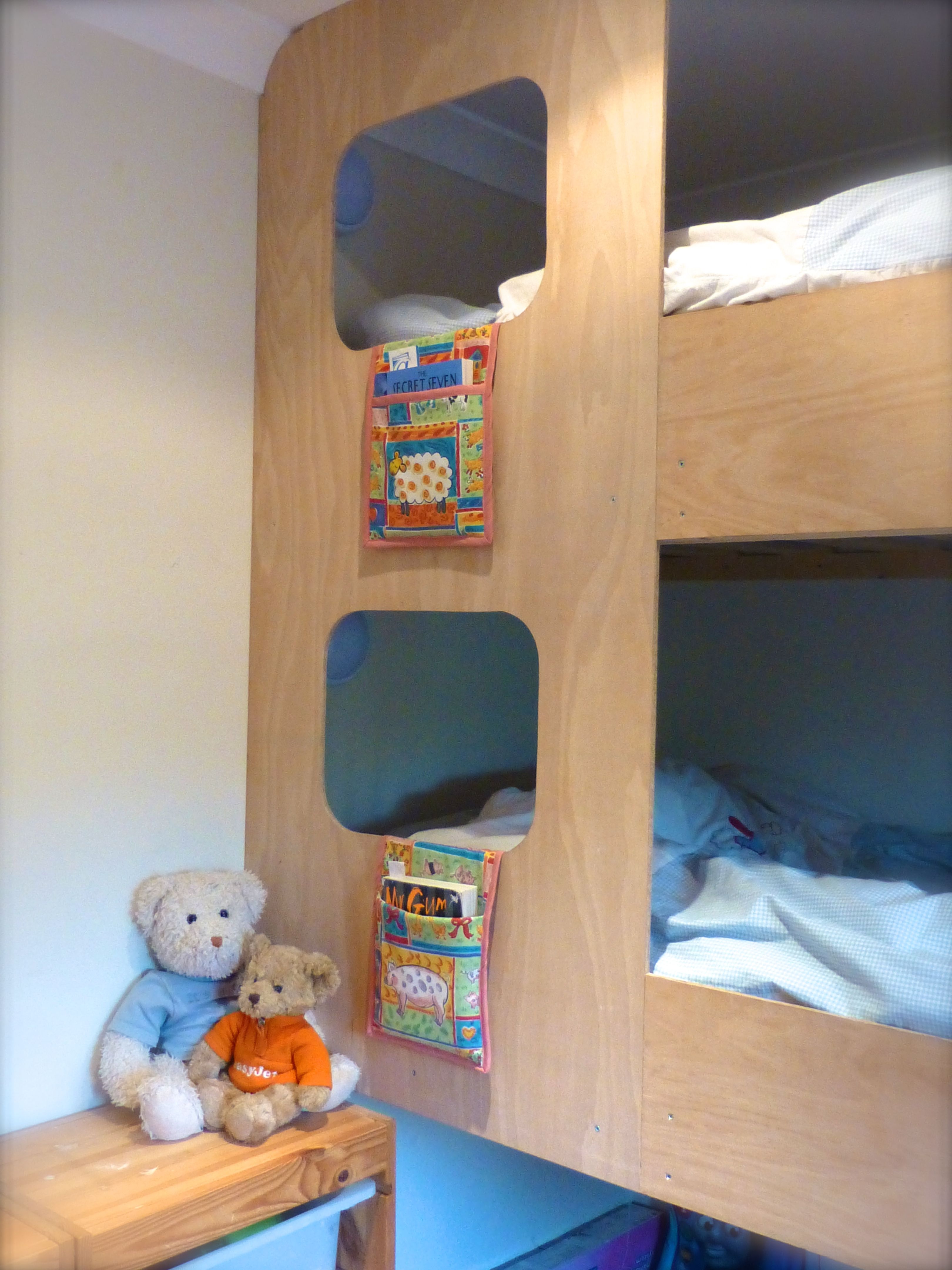 Not only are they ugly, but they’re often not the best use of space, so I designed a set of bunks that fit wall-to-wall (keeping the floor totally free for a den underneath) and hubby made them. And they even cost less than it would to buy the cheapest pine bunk beds on the market so a bit of a bargain to boot – and I do love a bargain:)