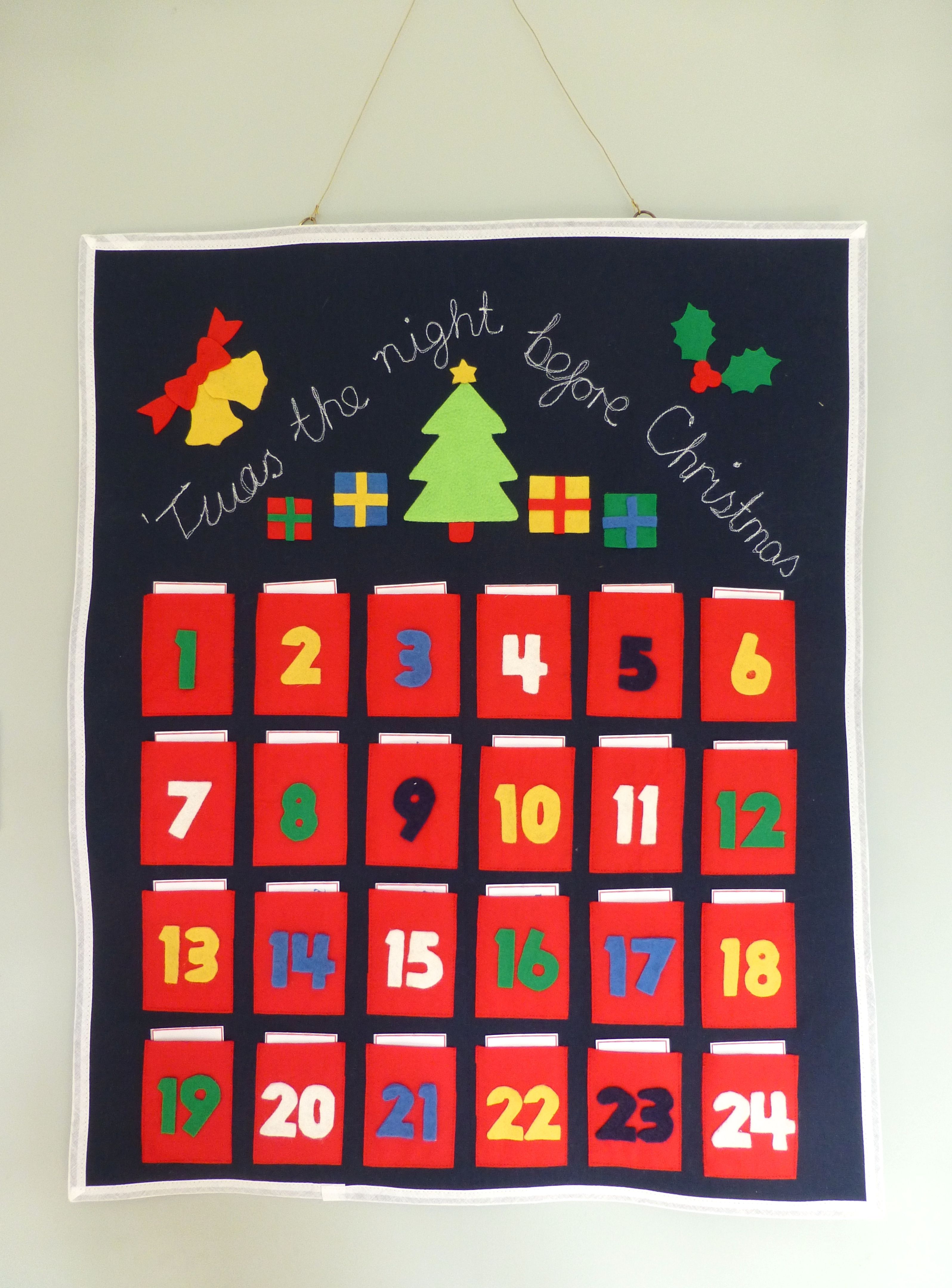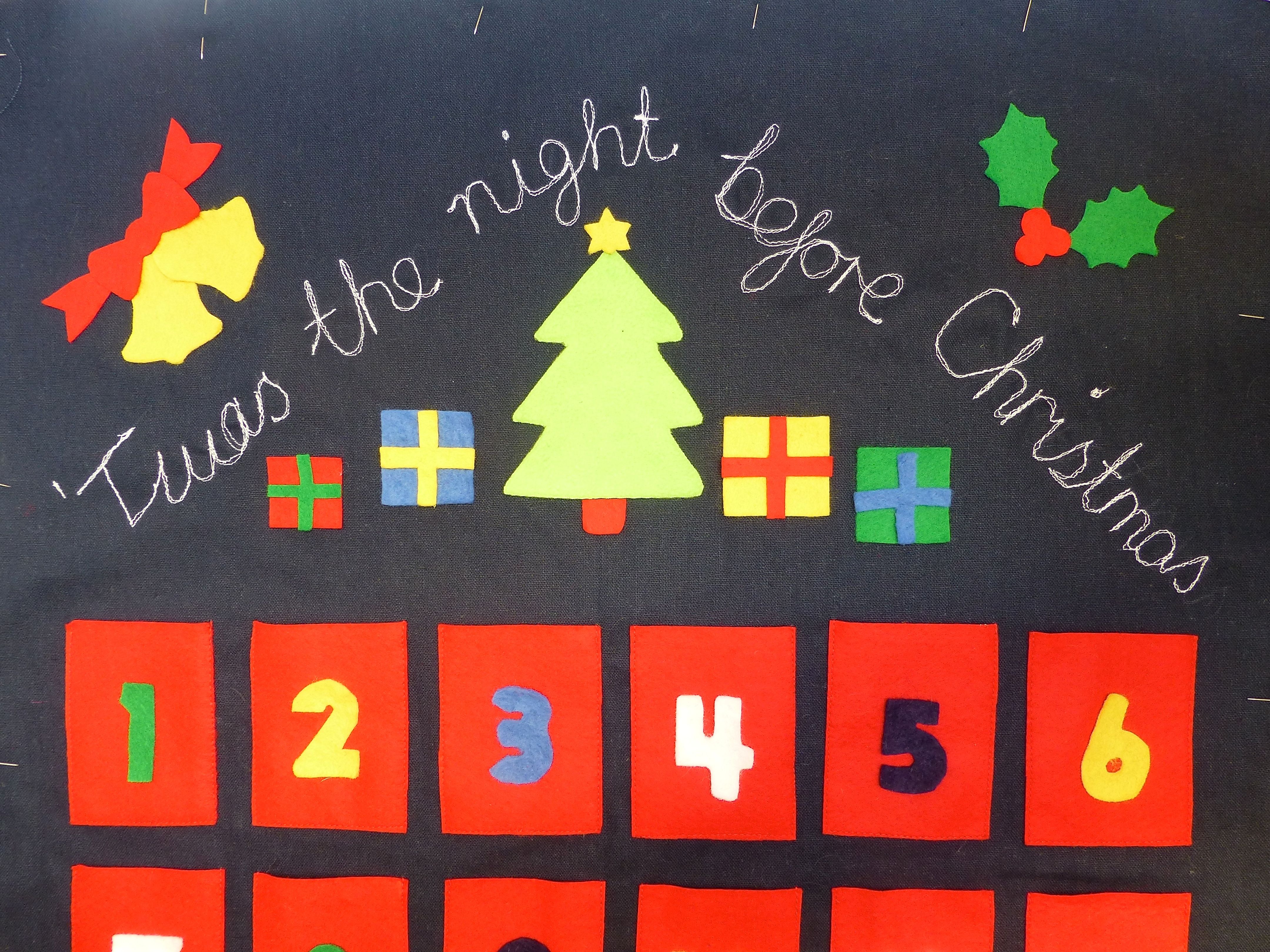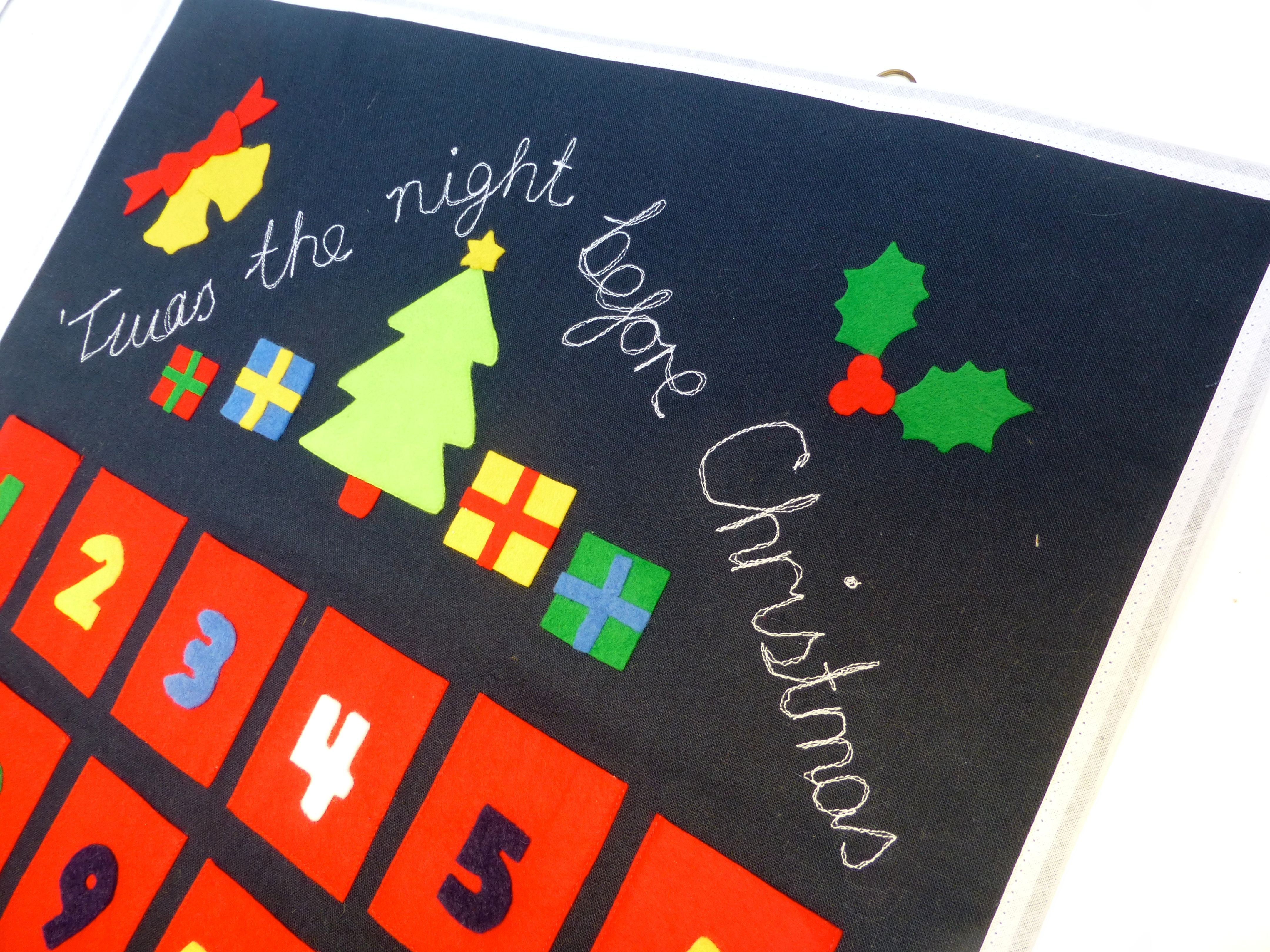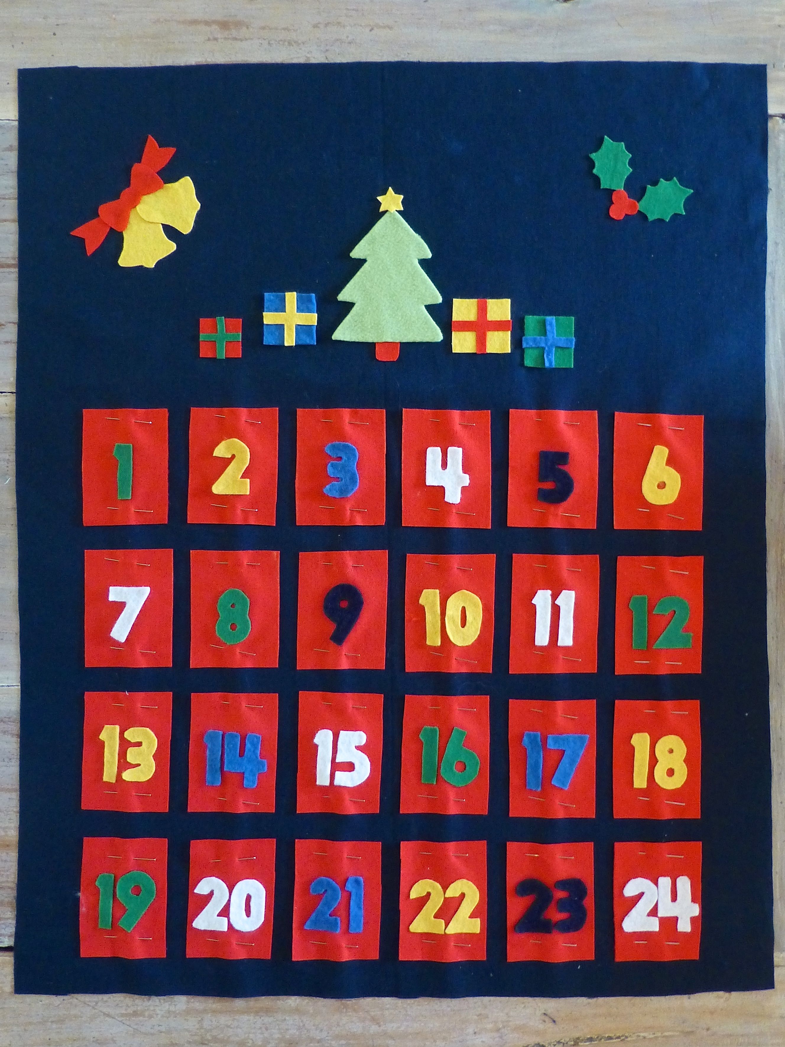 I used fridge magnets in the shape of numbers to trace around and cut numbers 1-24 out of different coloured felt. You could use stencils, download a suitable font off the internet or, if you’re particularly good at that sort of thing, draw them freehand.