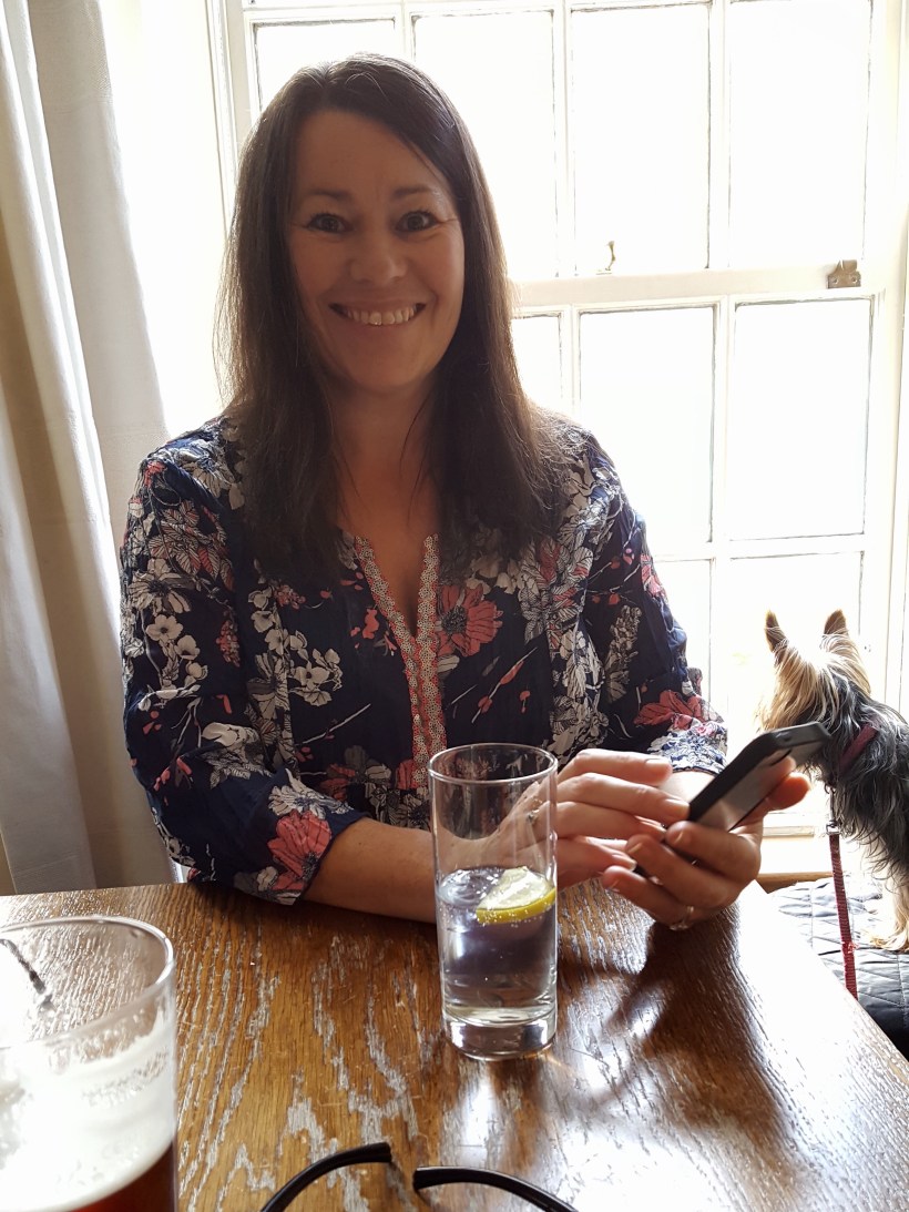 9. You can’t tell, but this is me having a G&T in our local pub. Fifi likes to sit on a coat on a stool and watch the world going by out of the window.