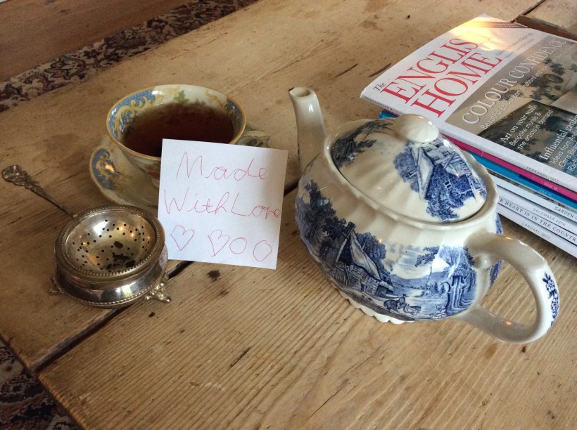 I’m hunkering down this afternoon while The Boys are at football. It’s cold, wet and windy outside and they’ve just presented me with a pot of Kusmi before they go.