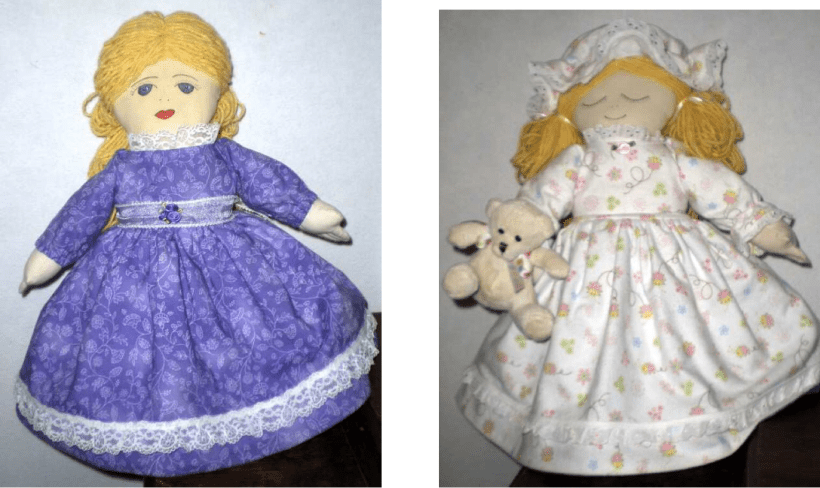 I found a free tutorial at Keepsake Crafts and pretty much followed it to the letter. This is her version, a daytime/bedtime doll: –