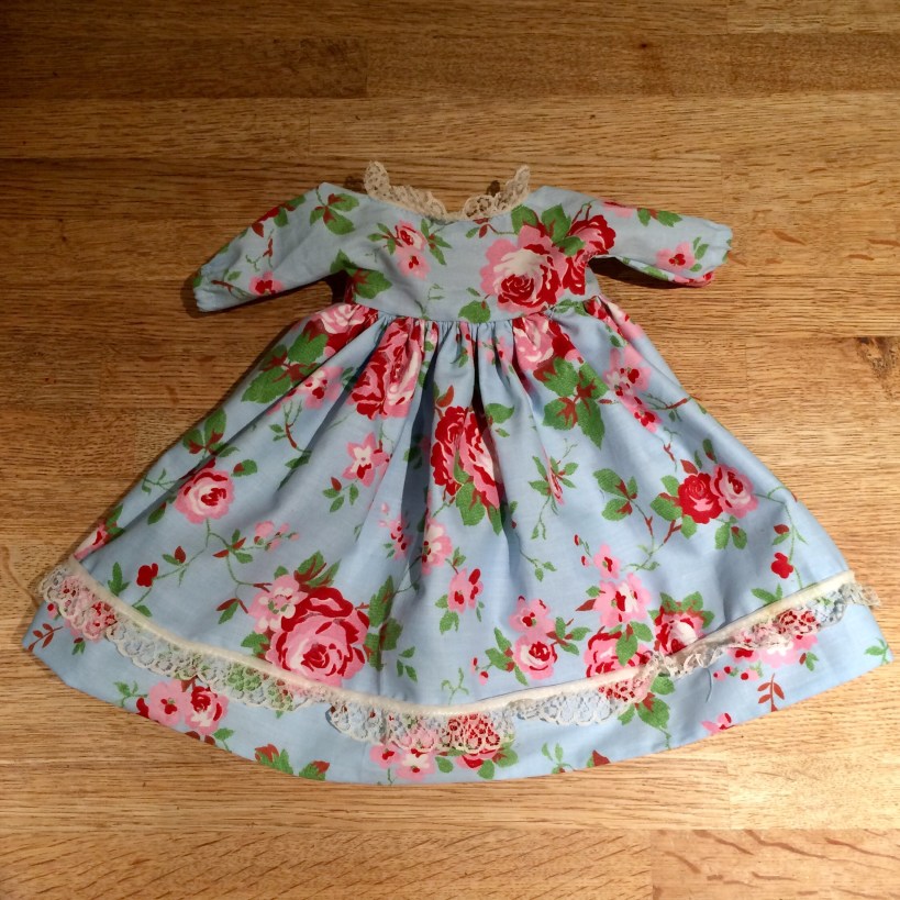 I used coordinating fabrics for each dress, originally from Ikea, I think; floral for the day dress and spotted for the nightgown and cap.