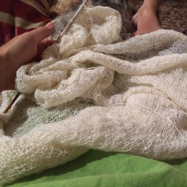 - Progress is slow but steady on the baby shawl I’m knitting. At this point I was one third of the way through and the statistics were; 35 hours, 560 rows and 40,324 stitches.