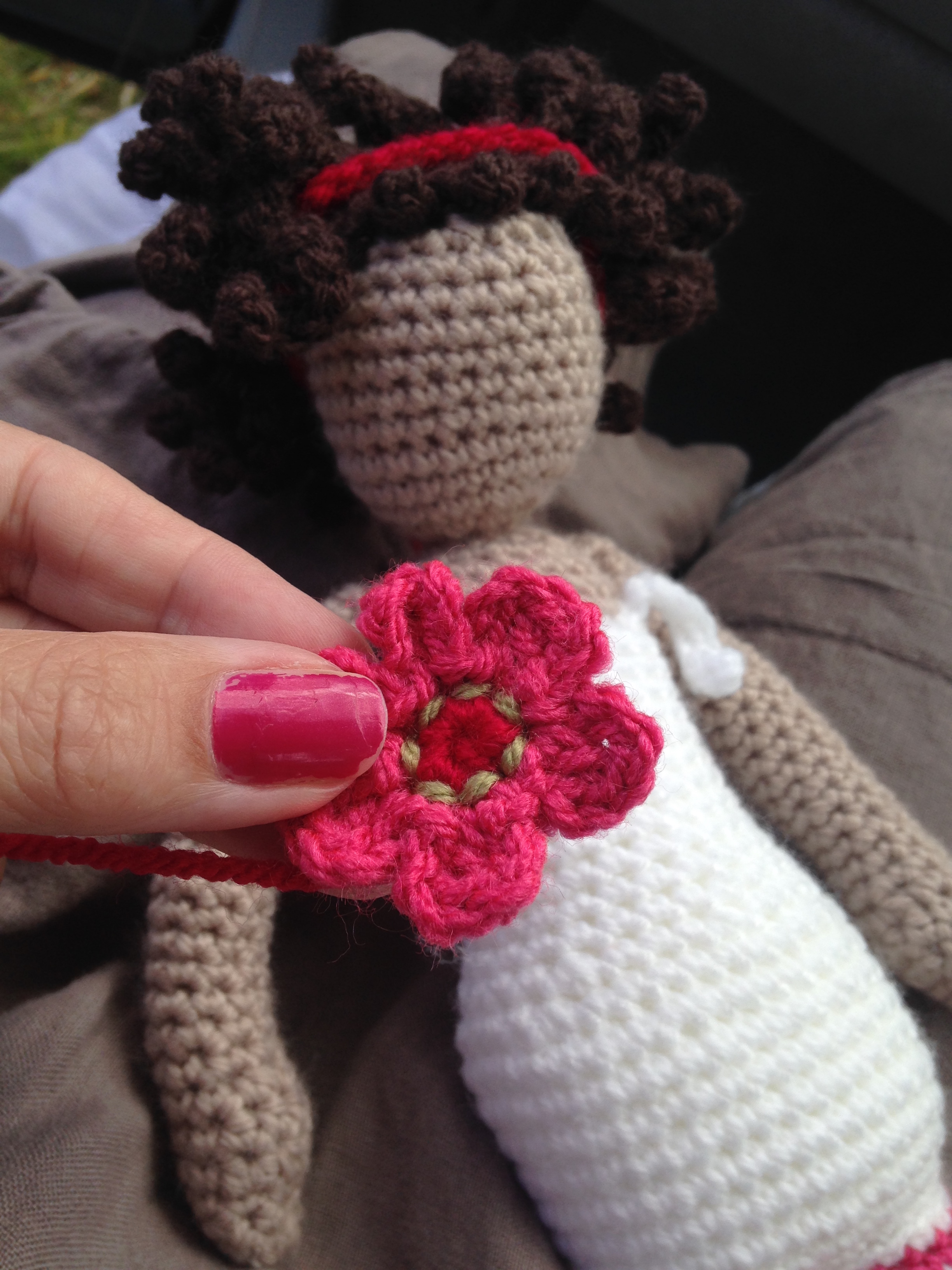 Remember I said you could chuck them in your handbag and crochet almost anywhere? This is Ginger’s skirt in process whilst sat in the car in a field for five hours while The Boys played in a football tournament on the way to Cornwall…..