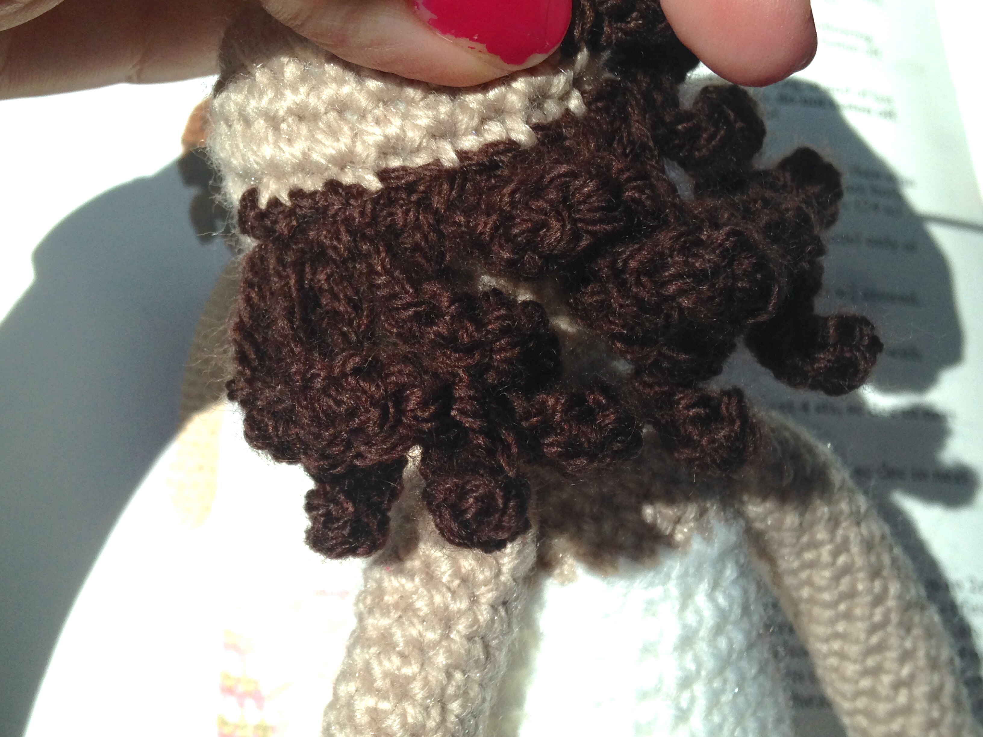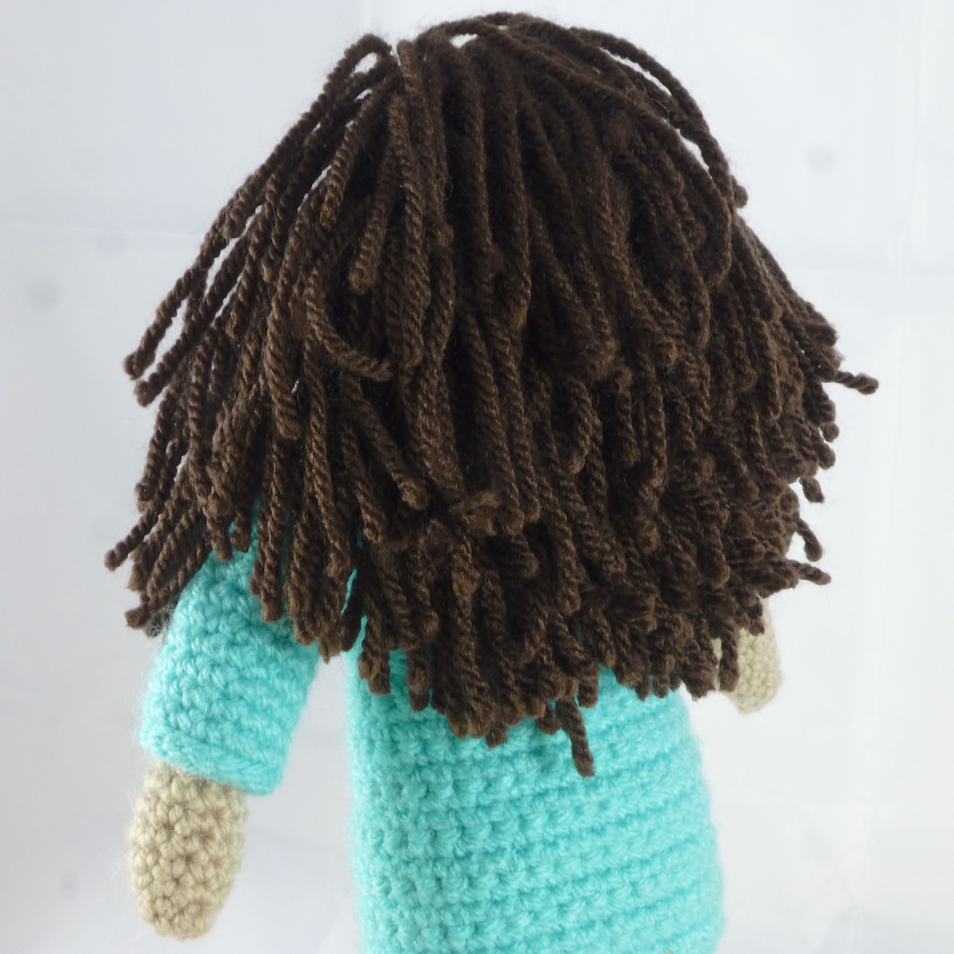 The hair is created using a darning needle and 135 strands of yarn, each one individually knotted onto a single stitch on the head!