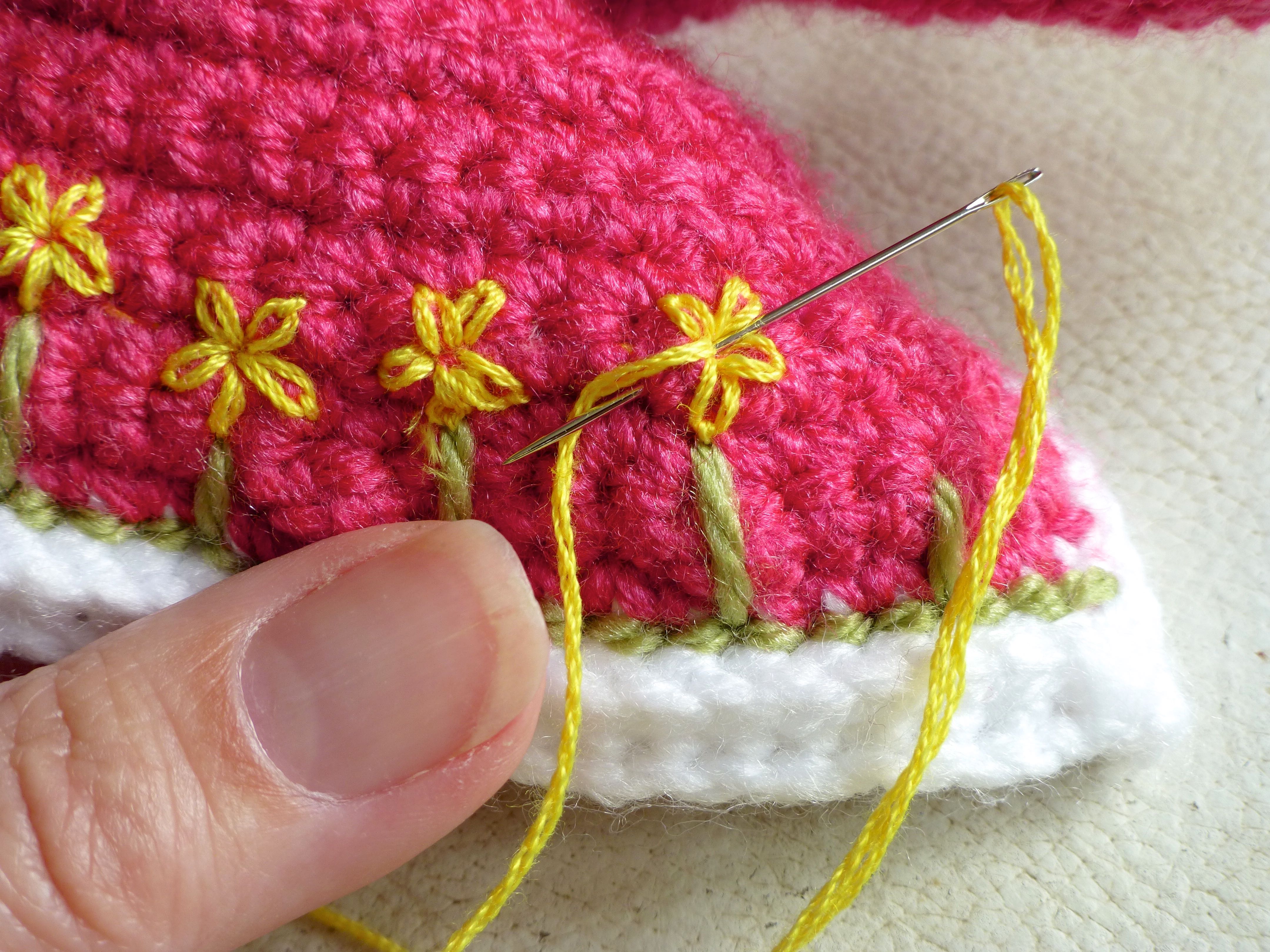 The ‘laces’ are just threaded through with a darning needle and tied in a bow to give the trainer look.