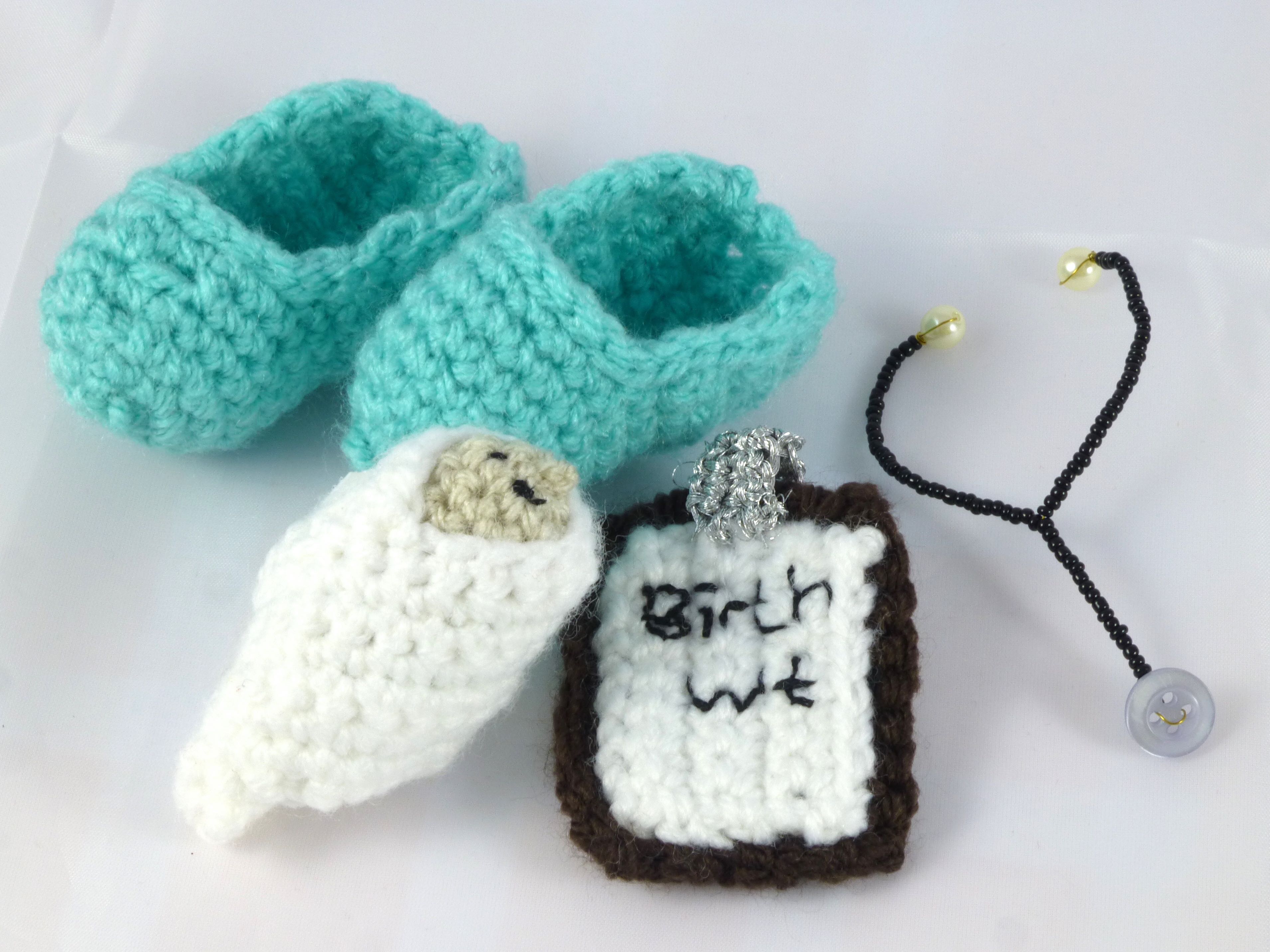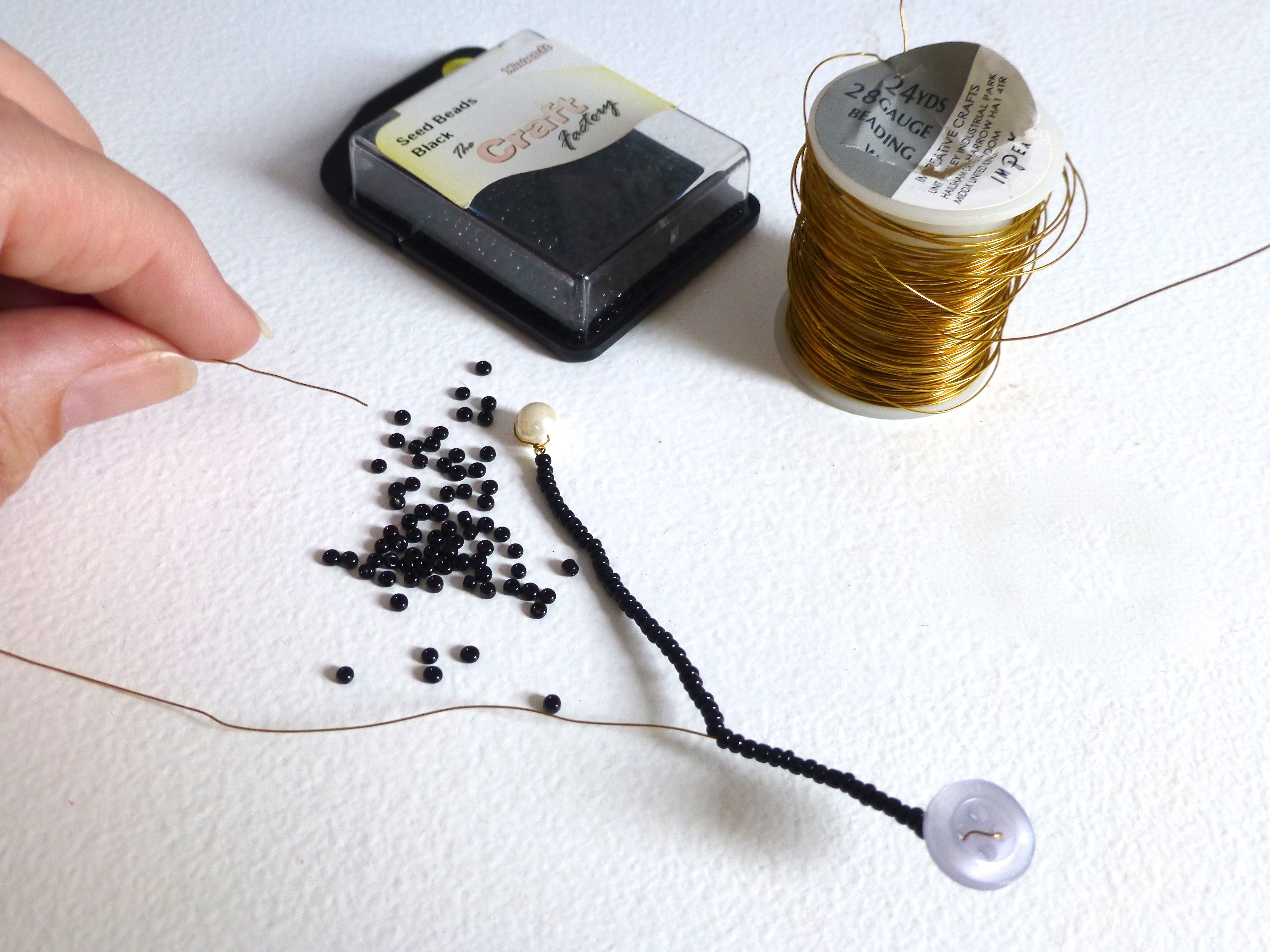 A stethoscope was made from thin wire and seed beads, adding pearls for the eartips and a button for the chestpiece. Quite fiddly to put together, but it looks ace!