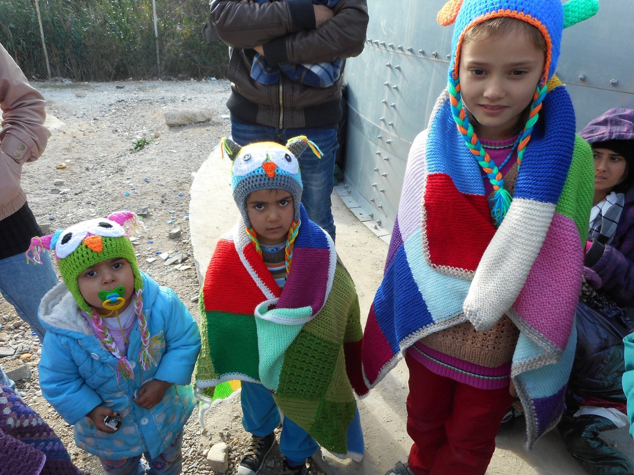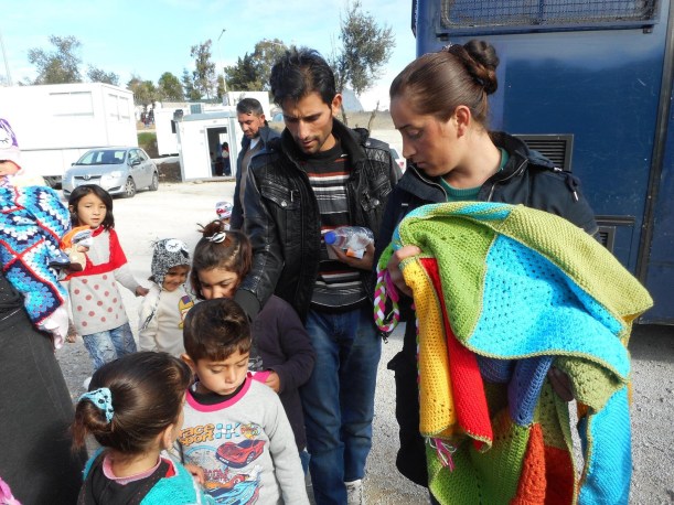Here is what she had to say, together with some photographs that she took of the refugees with some of the handmade blankets and hats: –