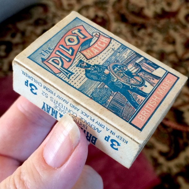See what I mean? Those turquoise buttons in the middle caught my eye straight away, as did the sparkly one on the pin. Then I spotted a familiar item from the past in the form of a matchbox.