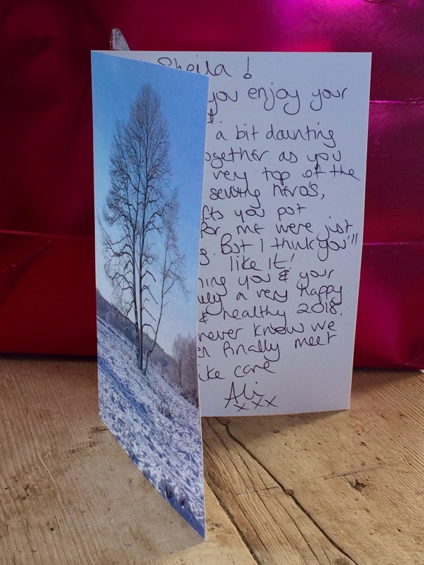 Last but not least was the card that Ali had included which threw in the casual remark that I was right at the top of her list of sewing heroes – not too much pressure for the coming year then!