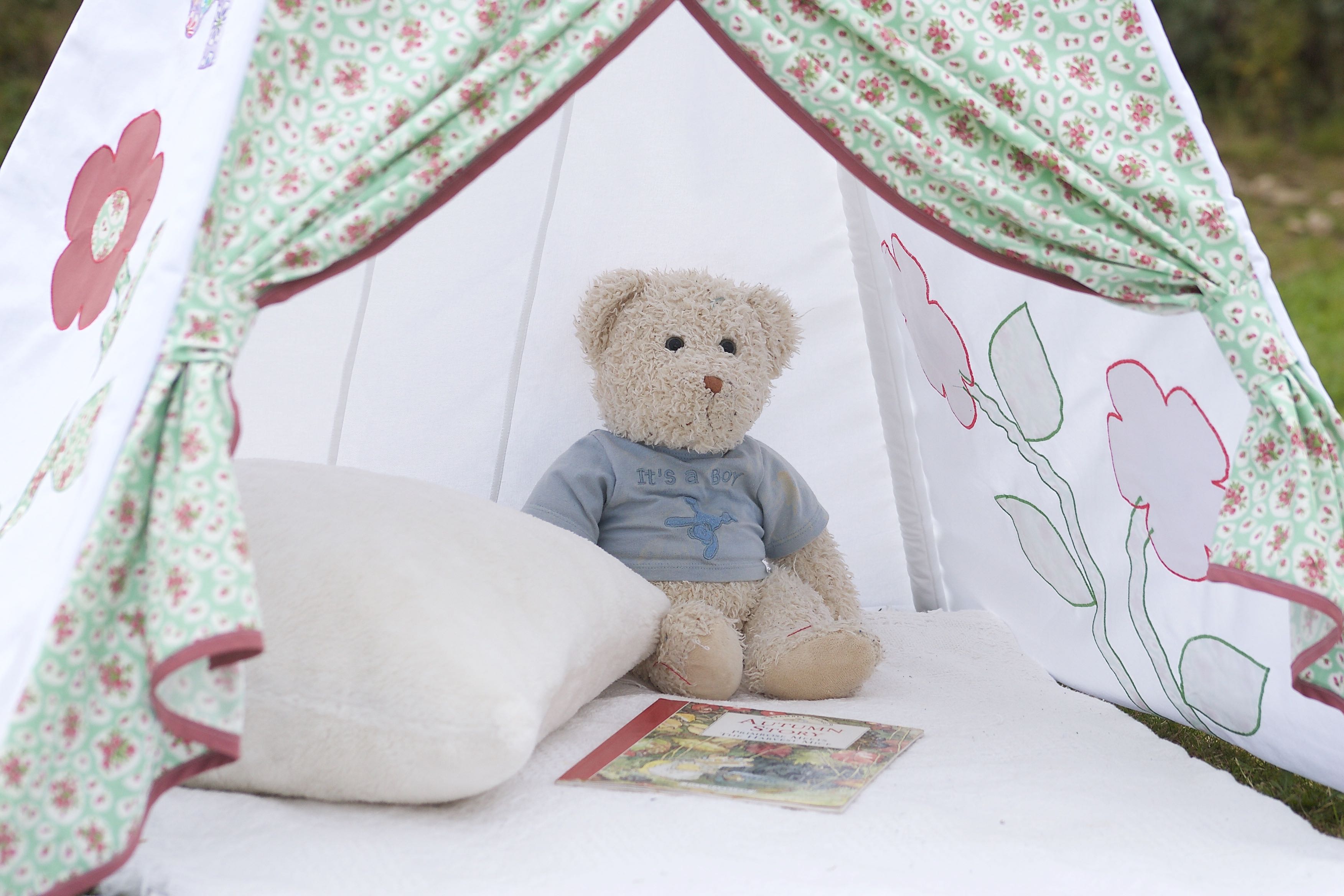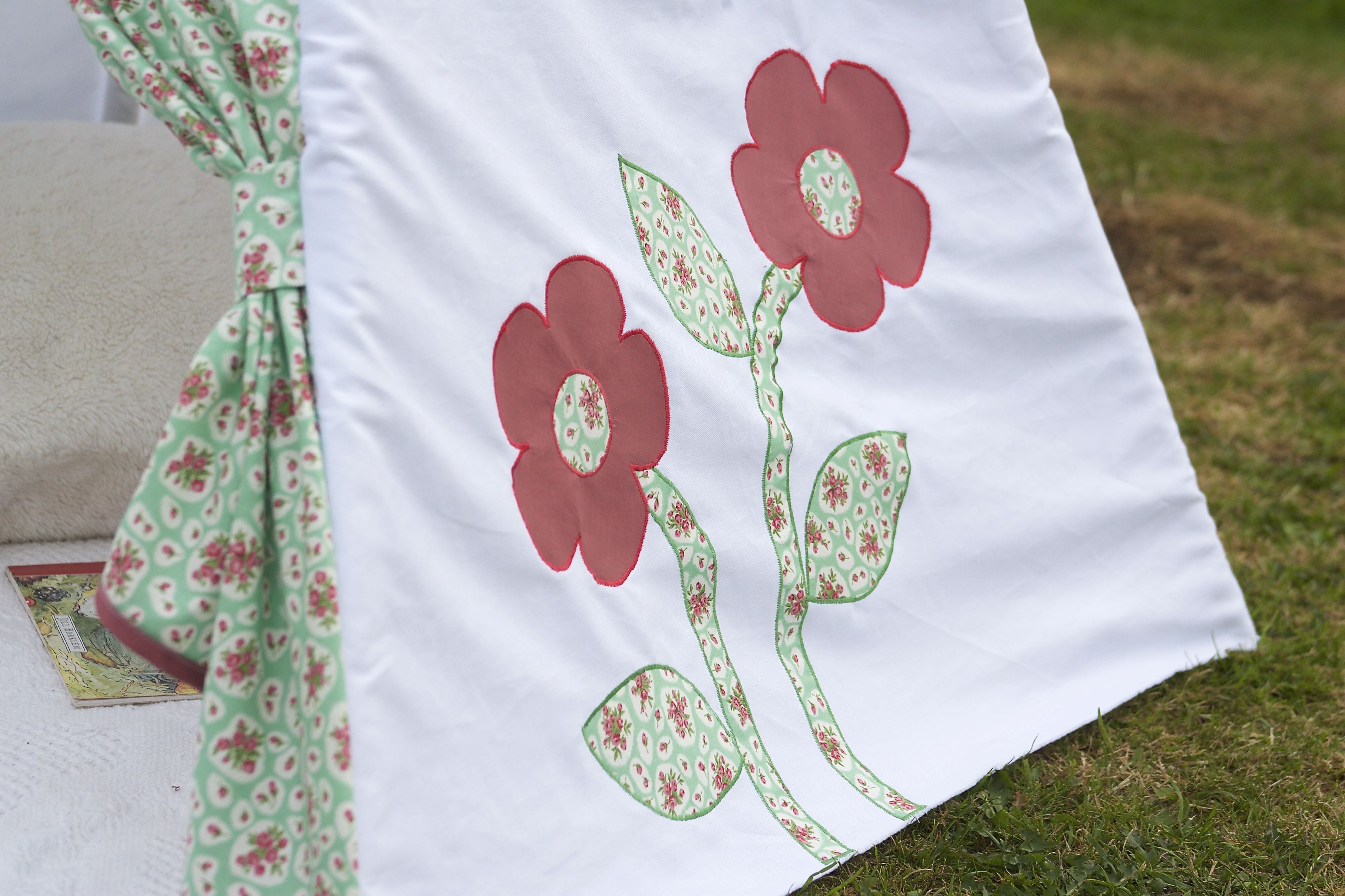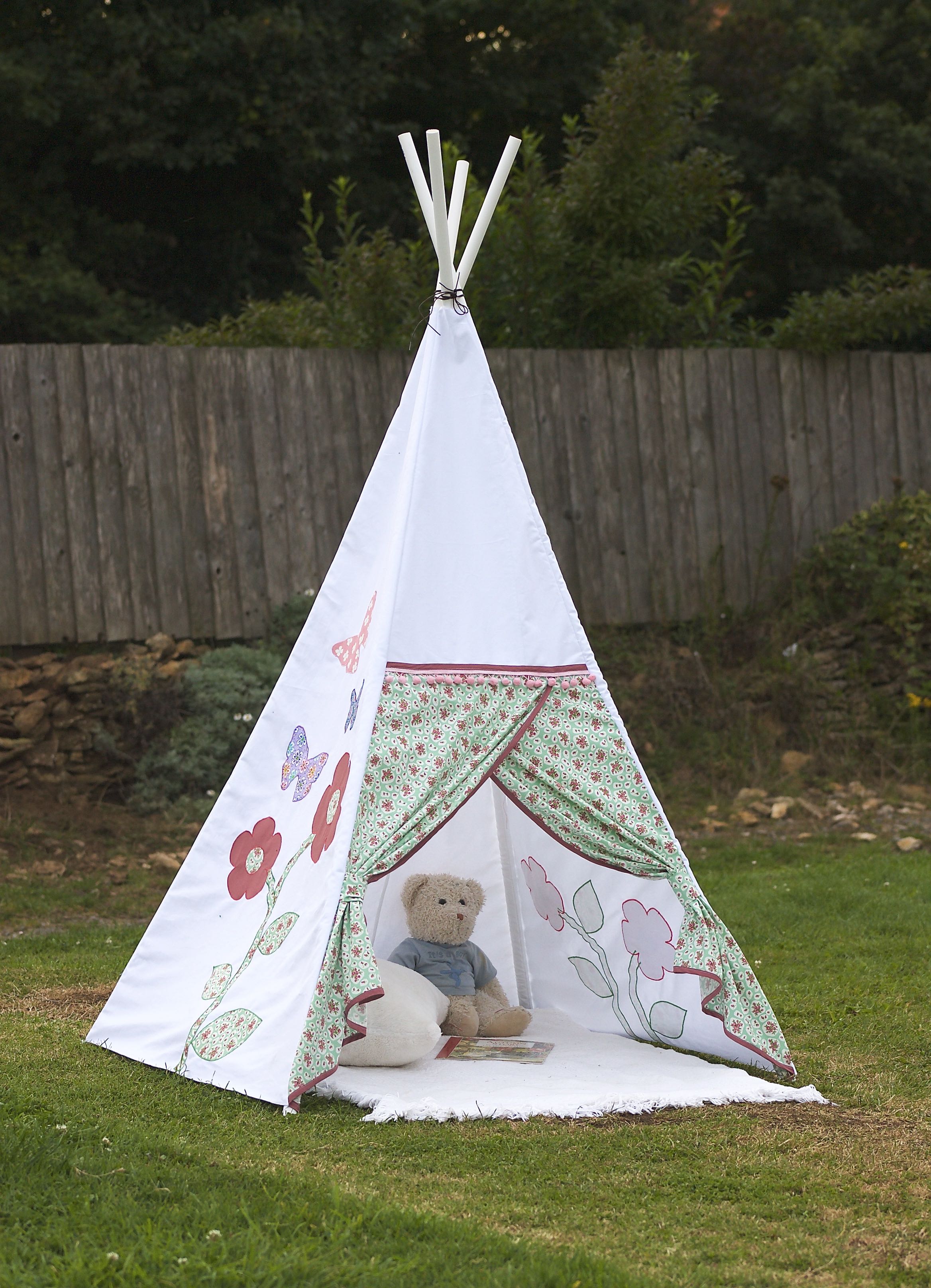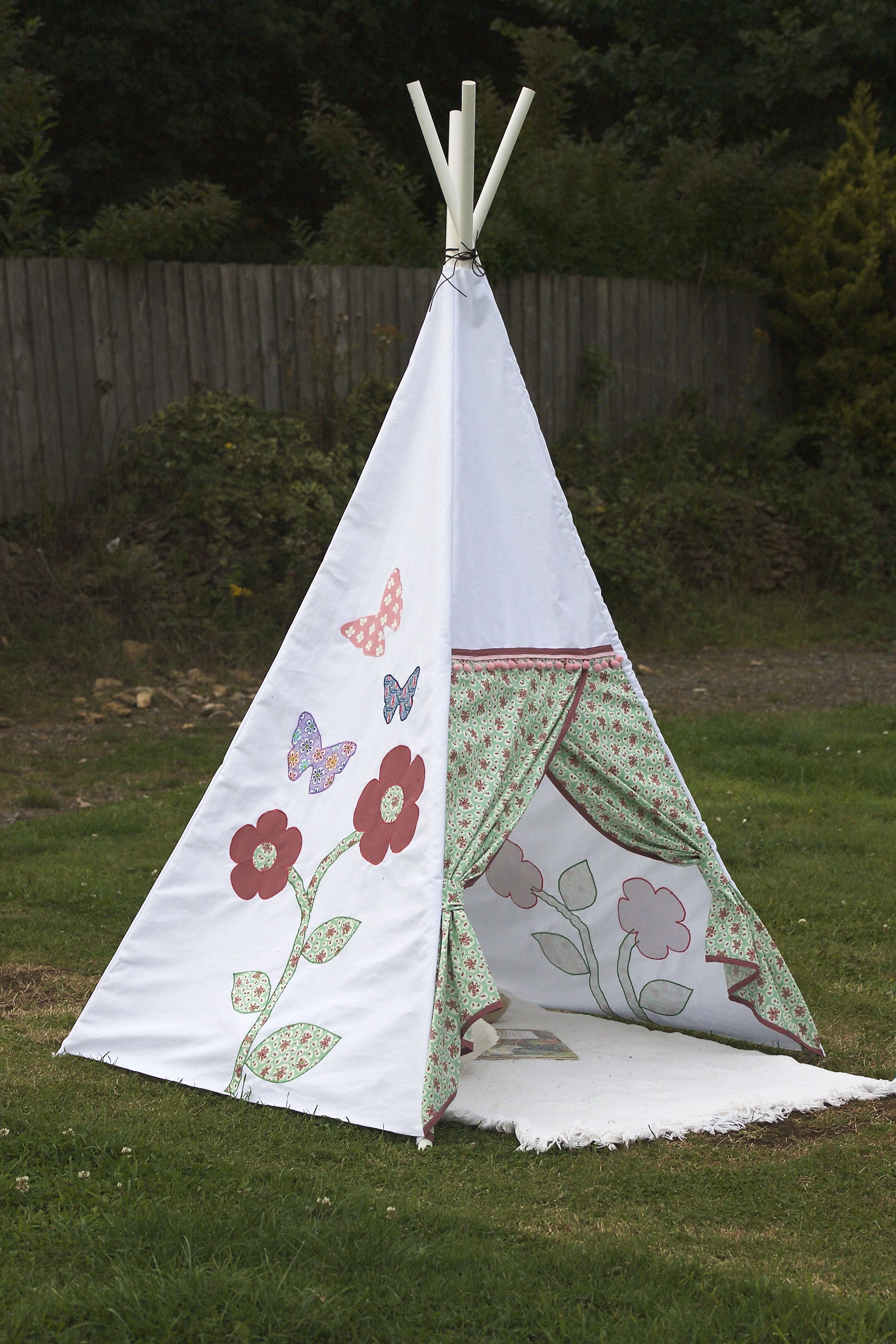 I decorated the sides of the teepee with a mixture of appliquéd flowers and butterflies – just click the links below to download the PDF for these.