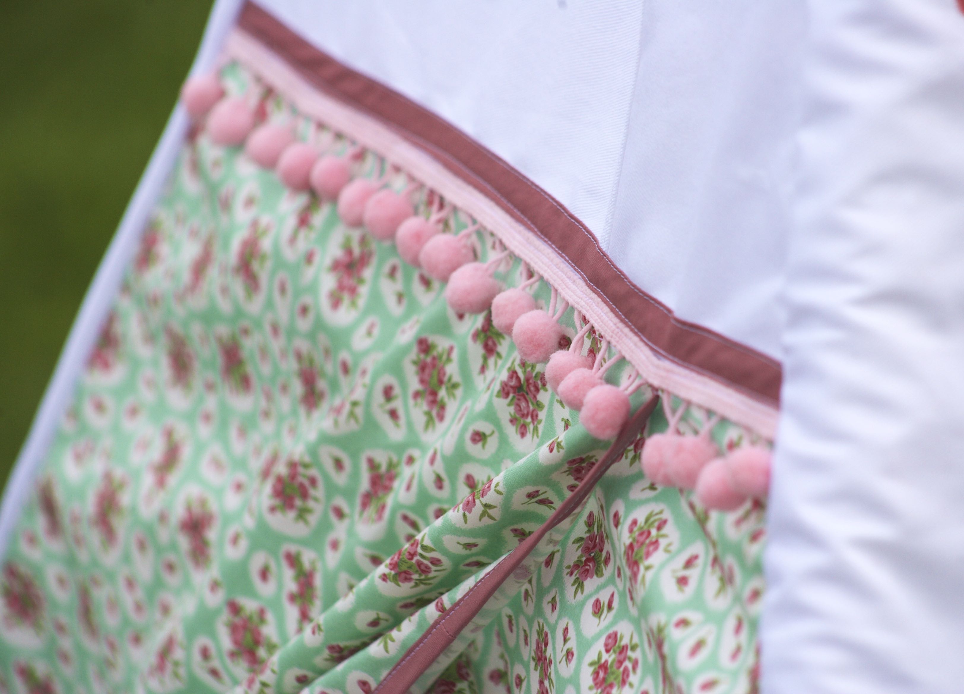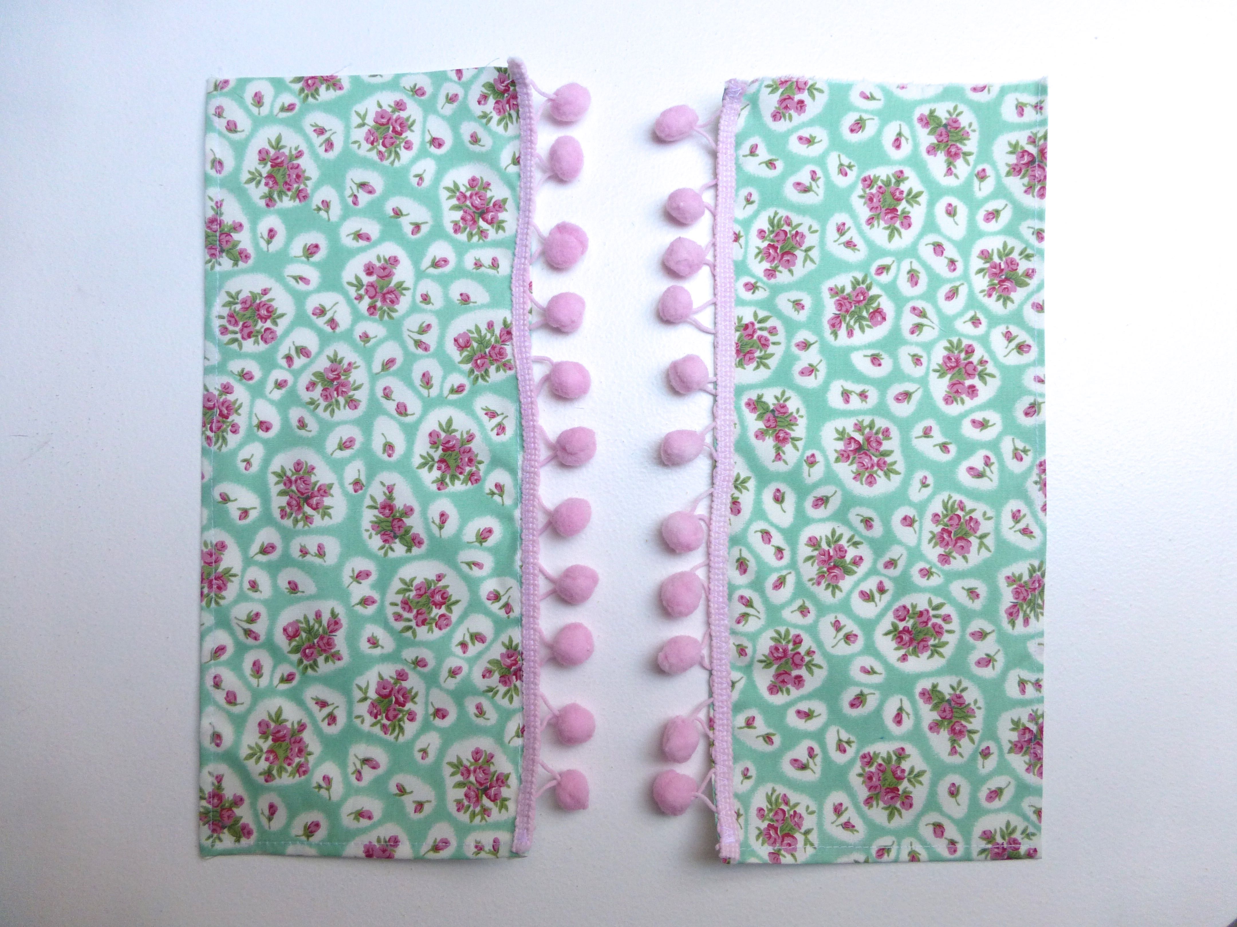 Hem all four edges and trim the opening edges with more pom pom trim.