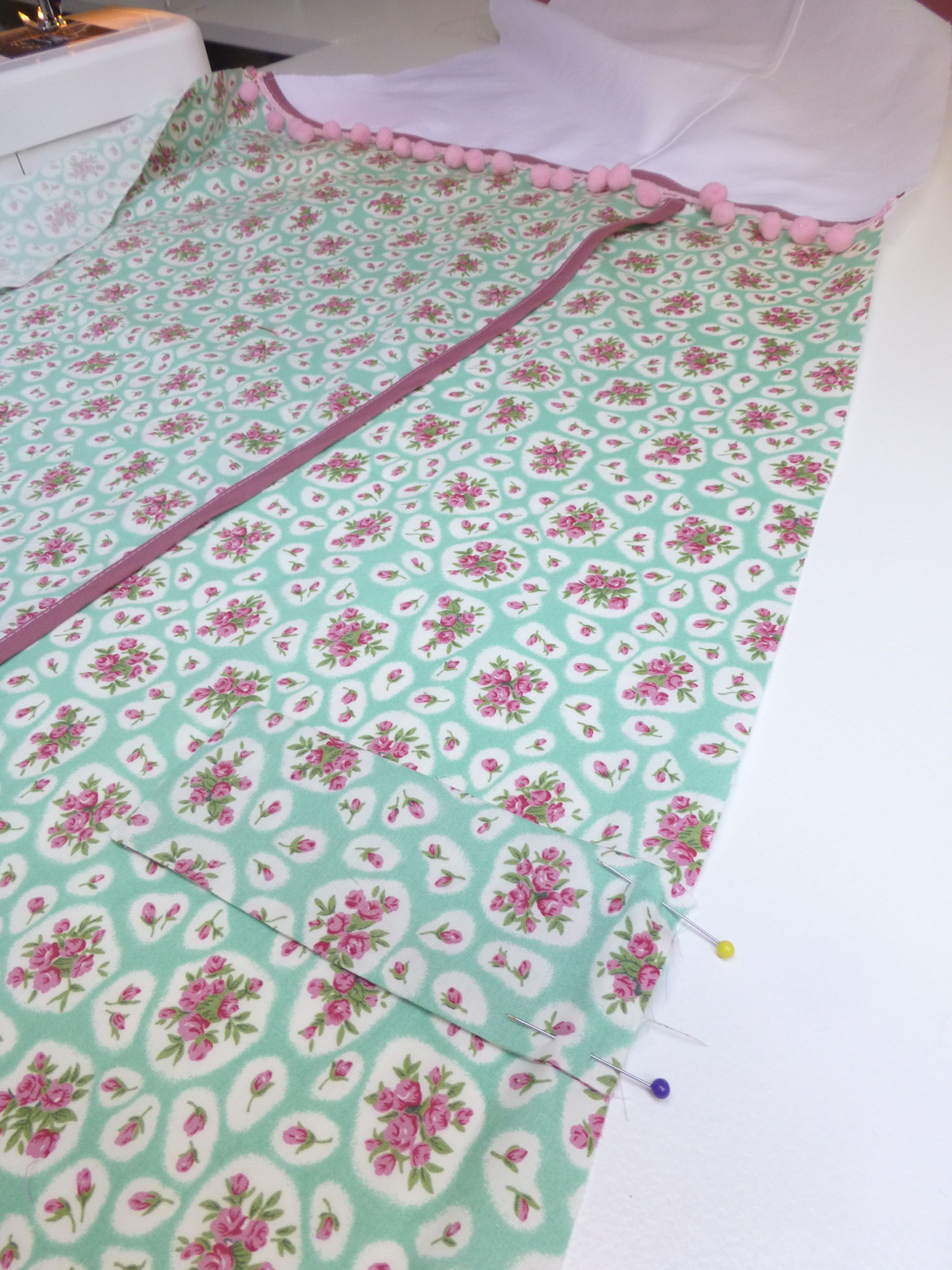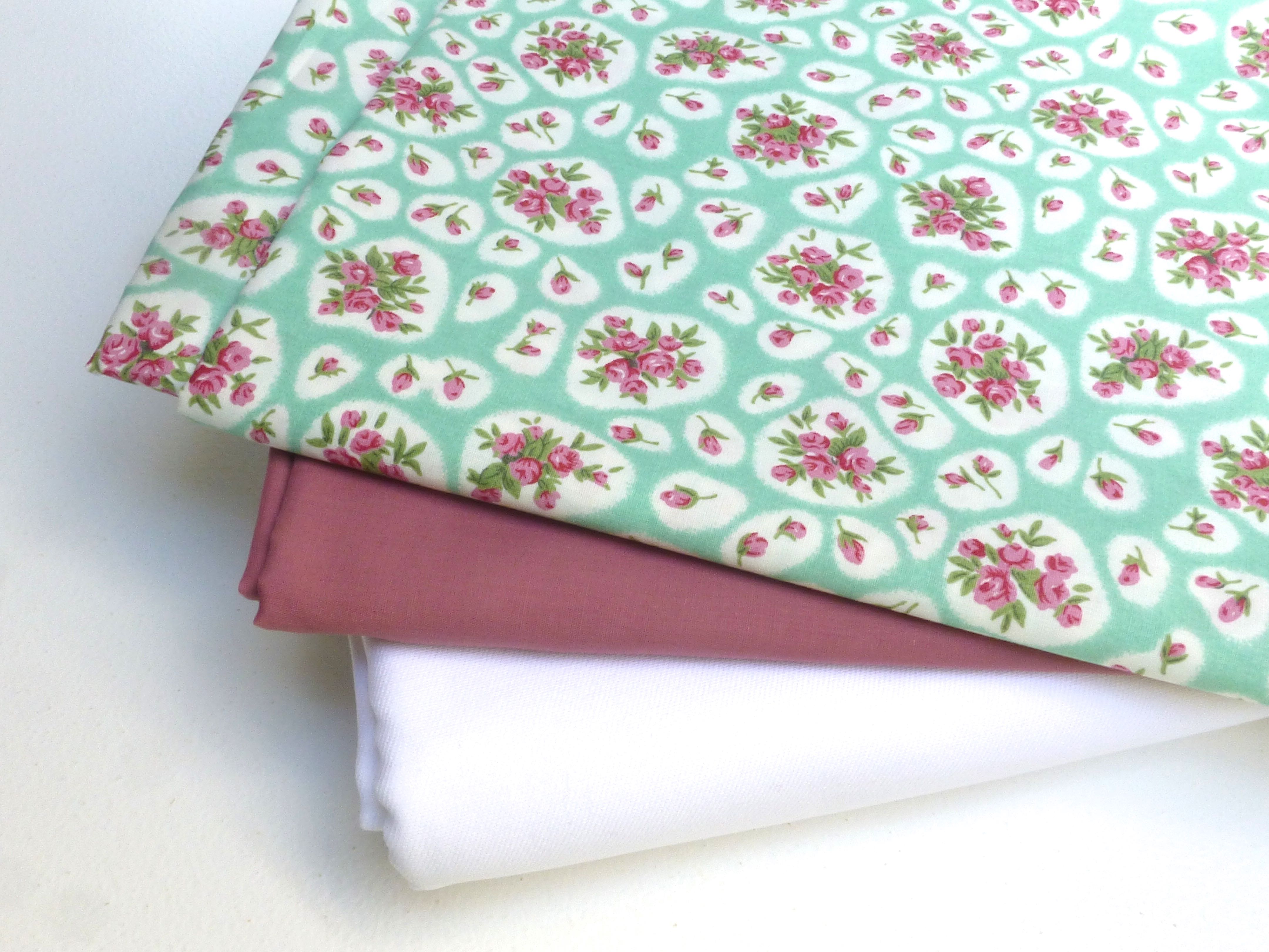 The white base fabric for the teepee is a thick cotton drill which makes a nice, strong tent. I also chose two contrasting fabrics which are lighter weight cottons; a gorgeous ‘Cath Kidston’ inspired floral cotton poplin and a dusky pink polycotton.