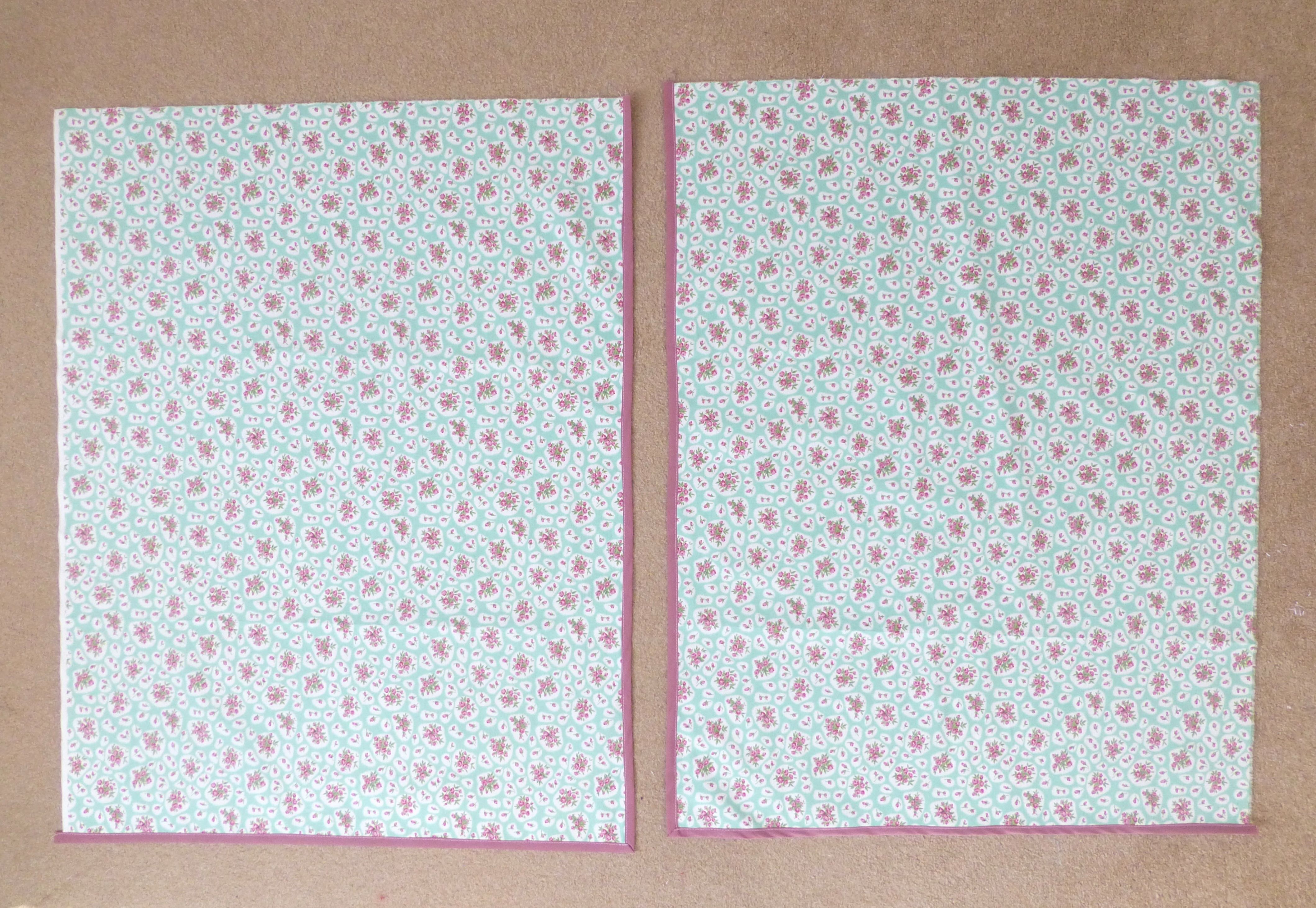 Apply bias binding to one side and lower edge of the two large pieces of floral fabric – these will form your front curtains.