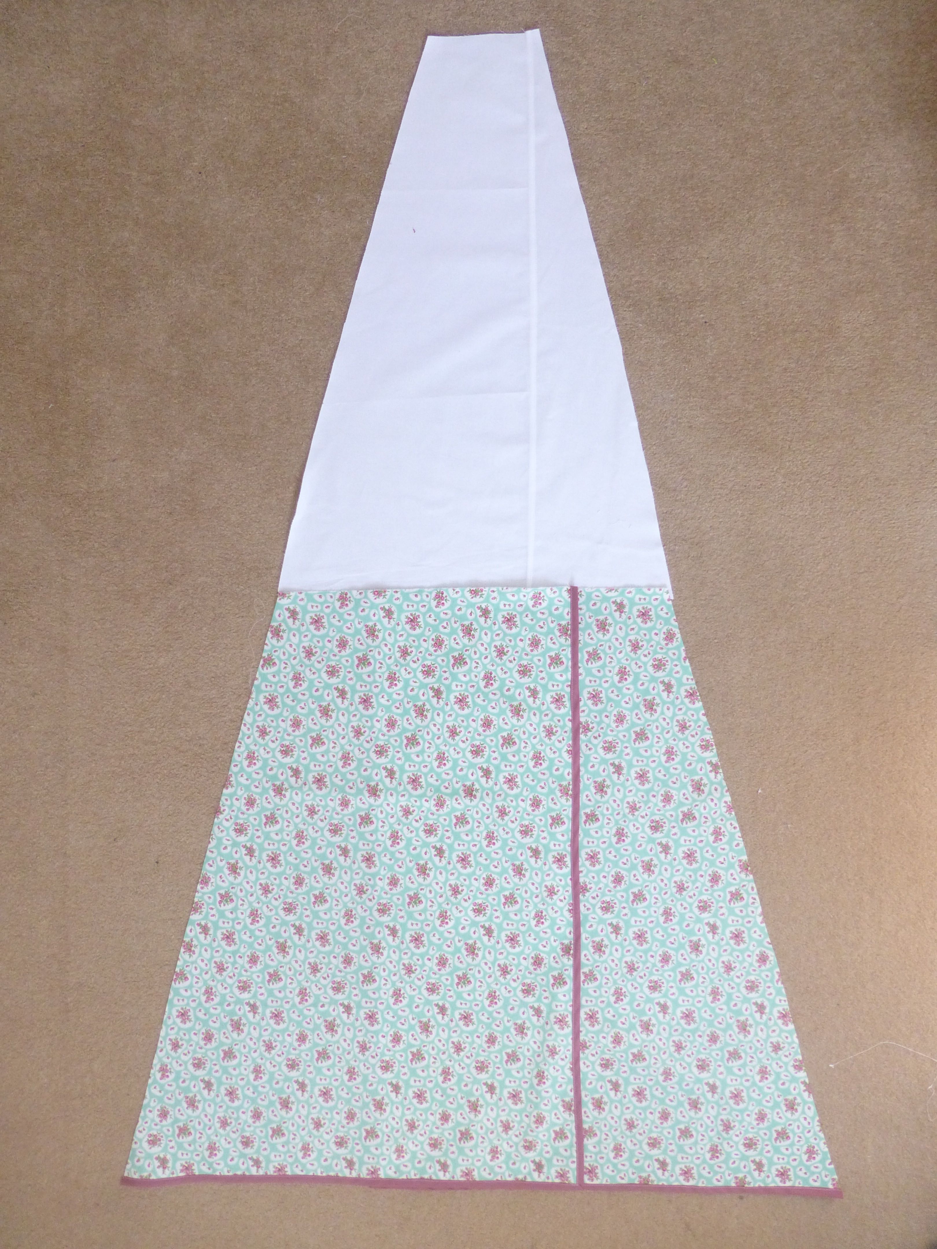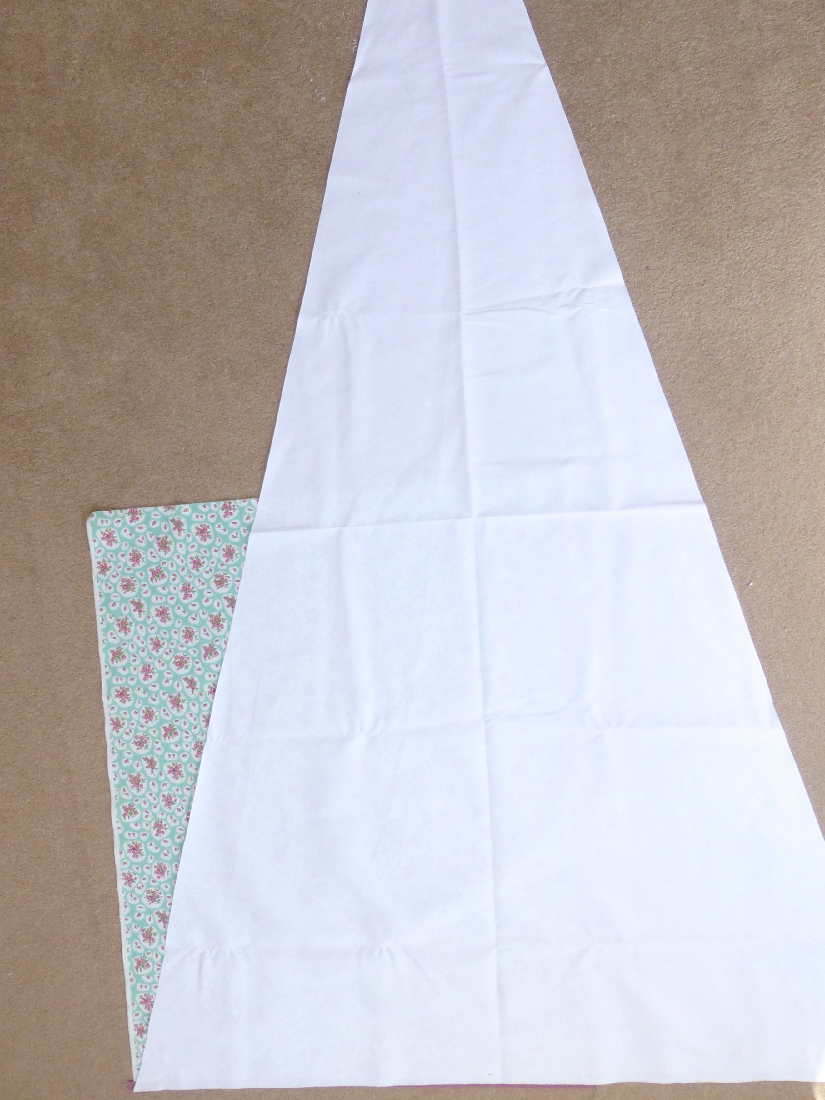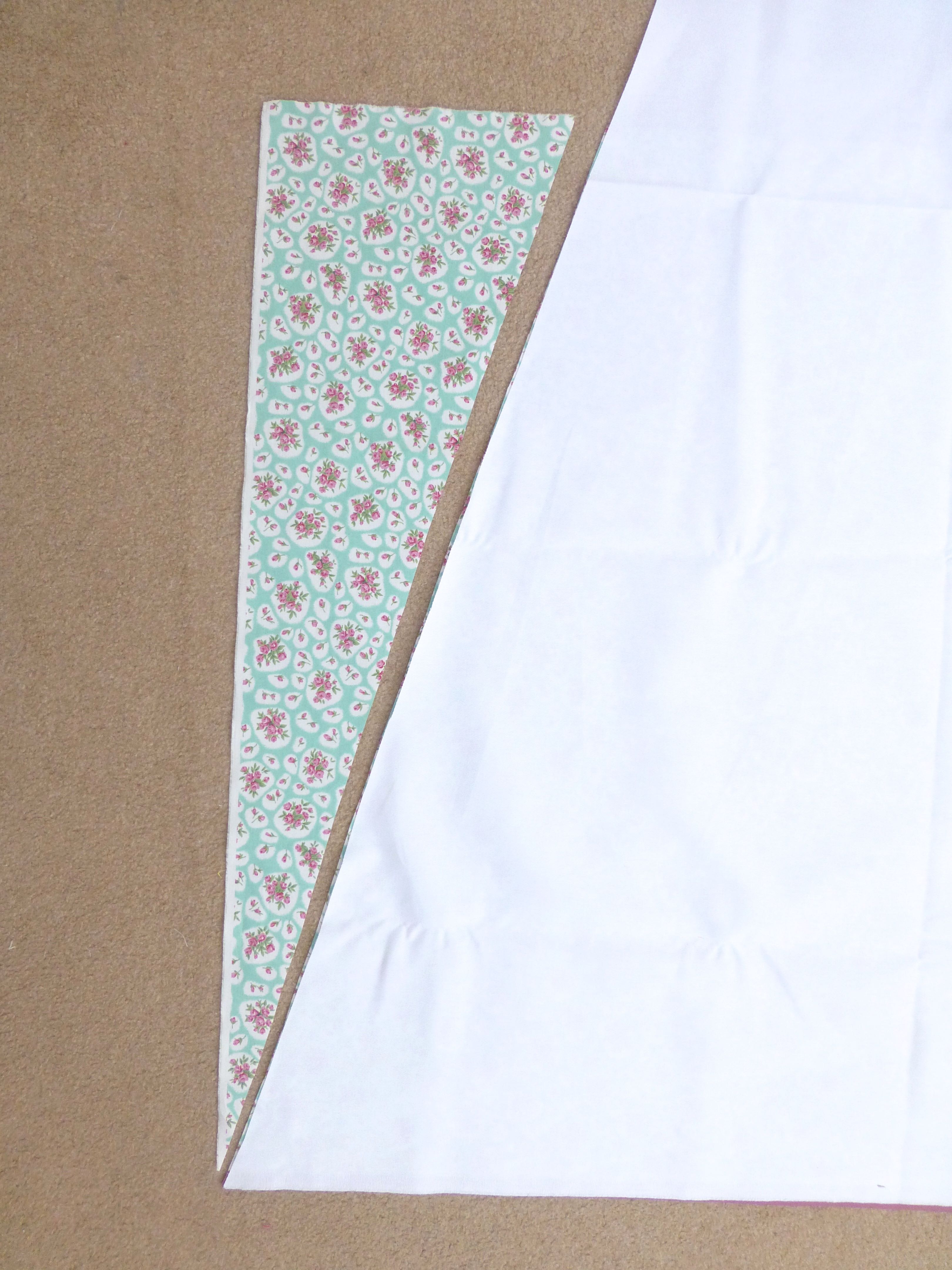 To shape the sides of the curtains to match the slope of the wigwam, place a large white triangle over the curtain, bottom edges matching and raw edges up the side. Your floral fabric will poke out beyond the edge of the triangle as seen below.
