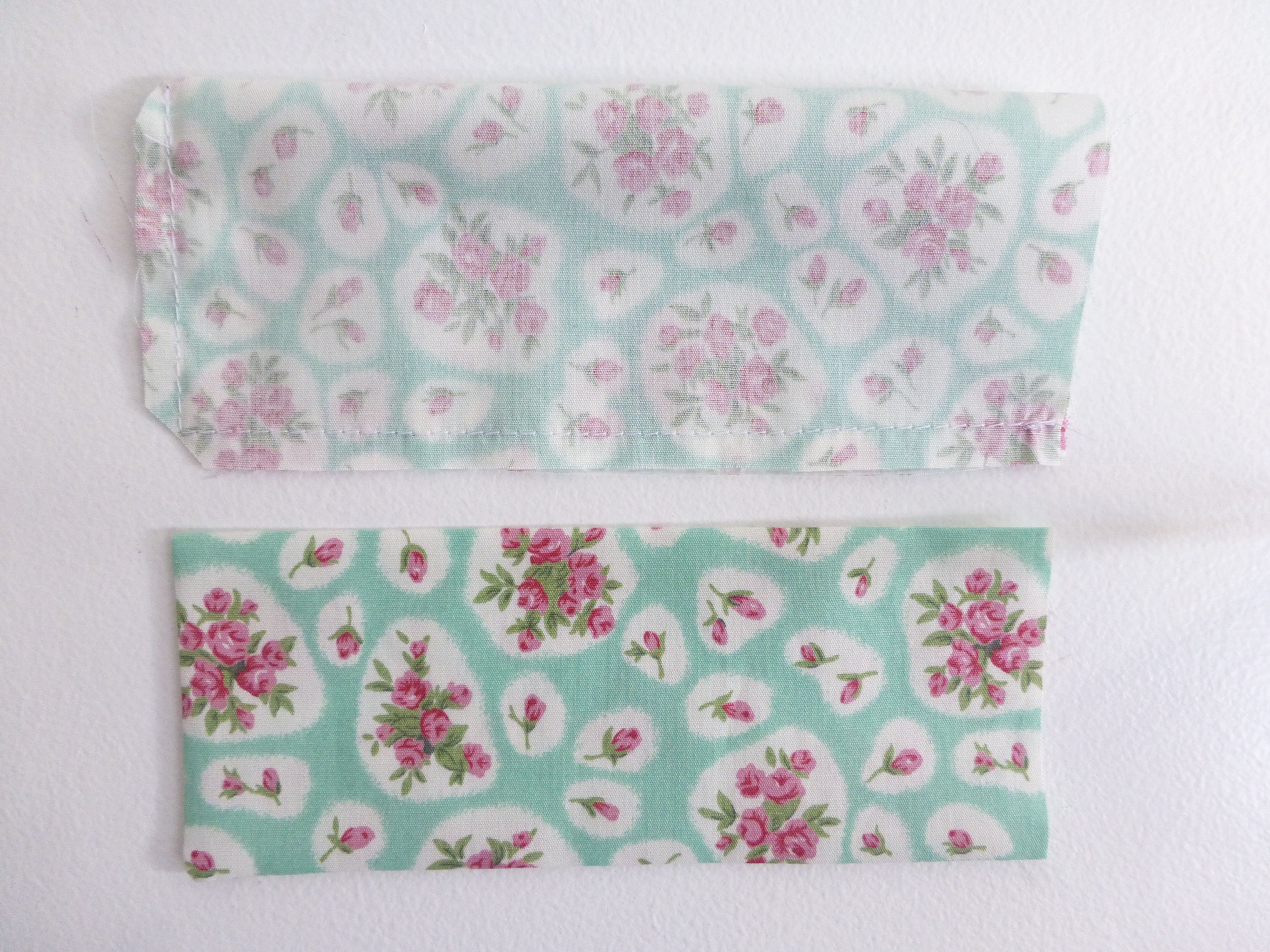 Fold the small floral rectangles in half lengthwise and stitch a small seam along one short and the long side.