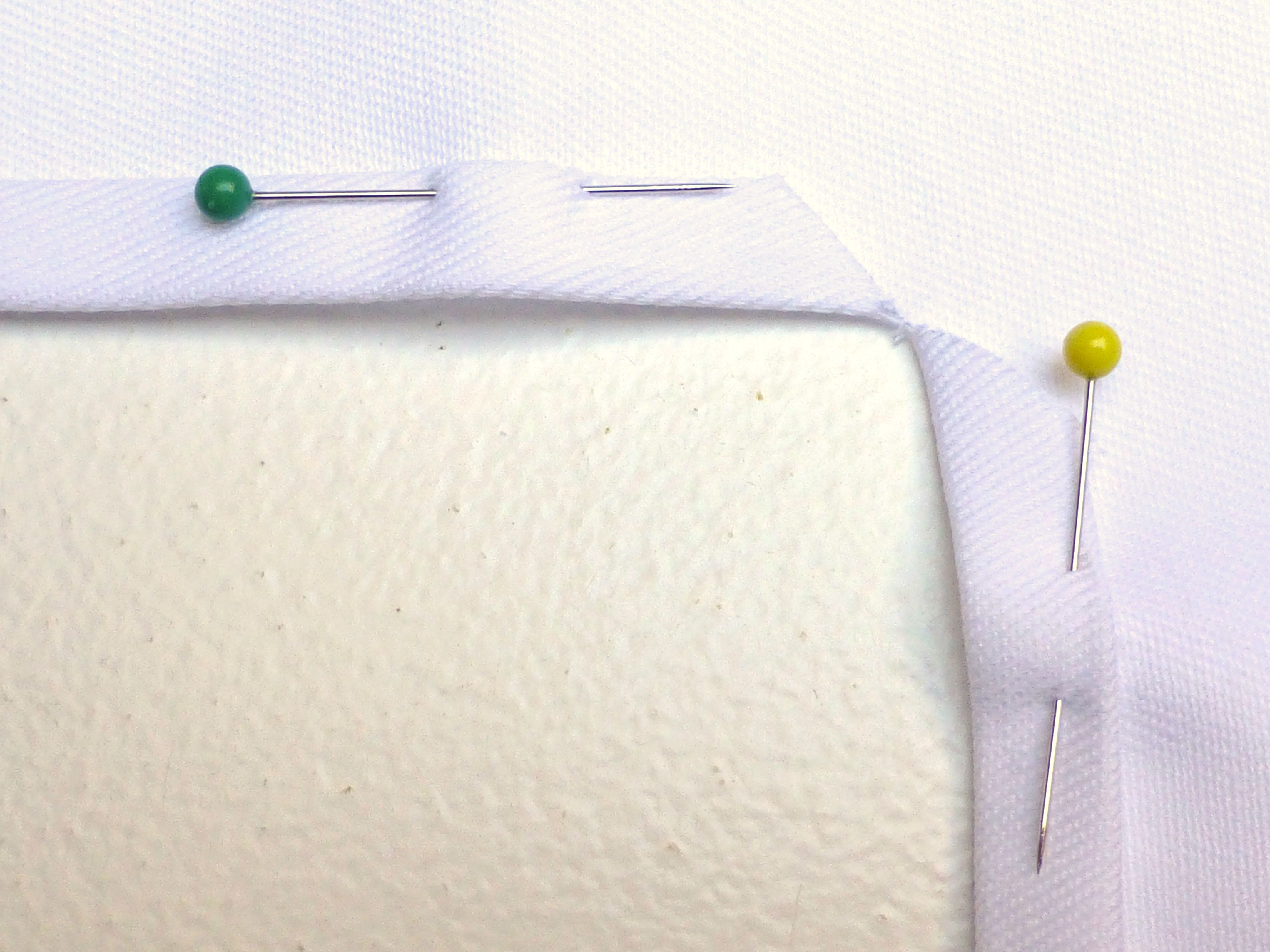 Snip diagonally into each corner by 1cm and fold in a 1cm double hem. Pin in place.