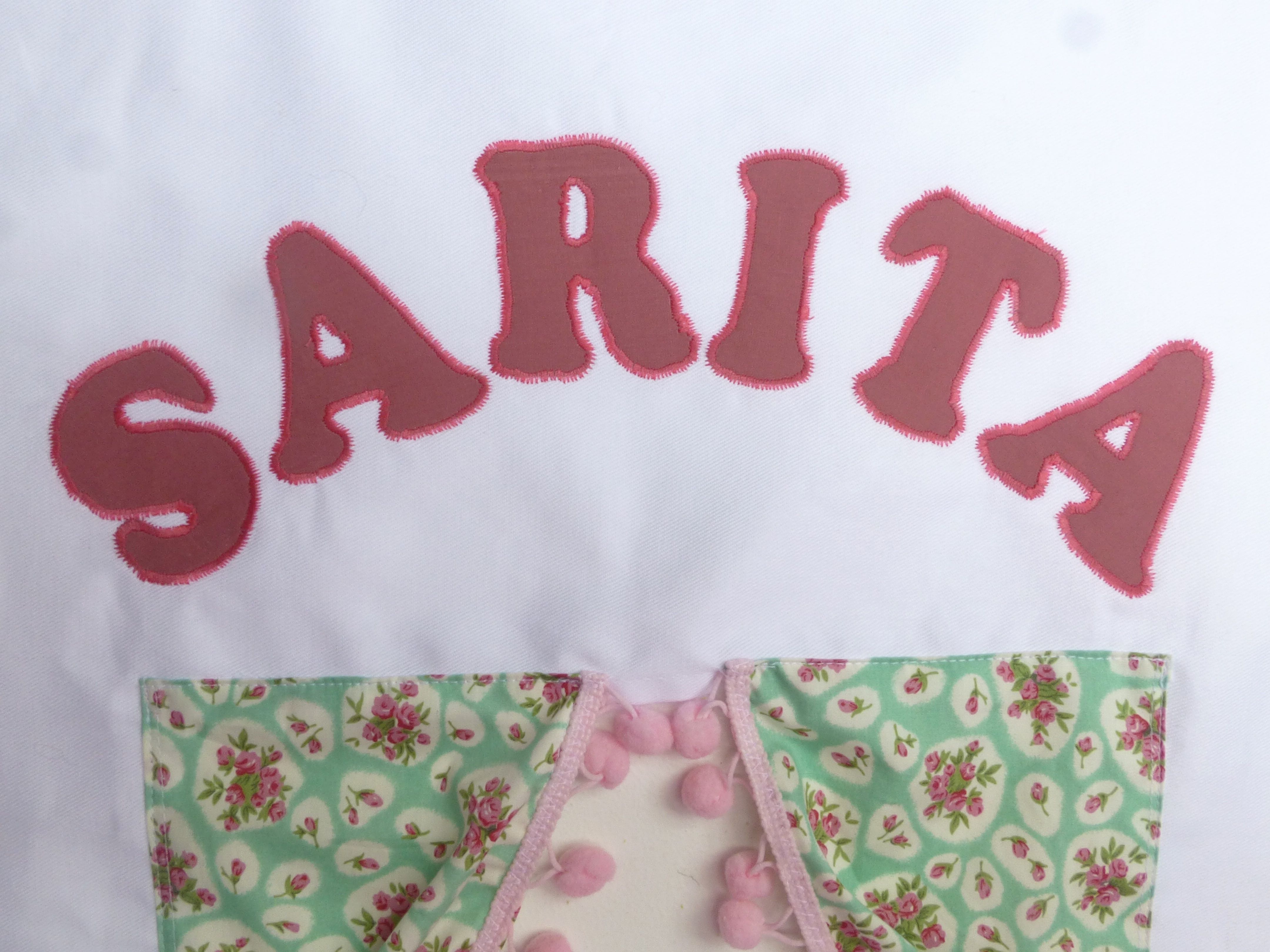 It is an amalgamation of several basic designs that I’ve come across which I have then personalised to suit the recipient using various appliquéd motifs and letters.