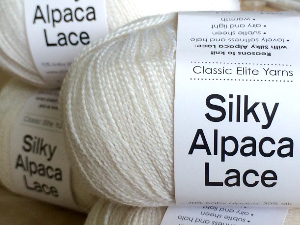 The baby was due in early October, which meant I would have to get cracking as three months is not very long in shawl-knitting terms, and I estimated that about 60 hours of handknitting would be required. I had no problem choosing the perfect yarn – the softness of Alpaca combined with the smooth quality of silk made this the obvious choice.