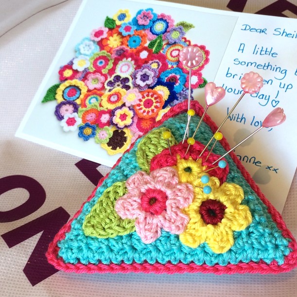 9. She also sent me this lovely little crocheted pin cushion complete with pins! I’ve long since admired these on her blog and am delighted to now own one. And just look at that postcard……it certainly did brighten my day.