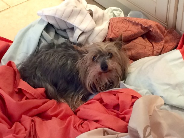 12. Back home, laundry from the flat was piled up waiting for its turn in the washing machine. The only thing that could be better to curl up on, from a dog’s point of view, is dirty underwear. Just sayin’.