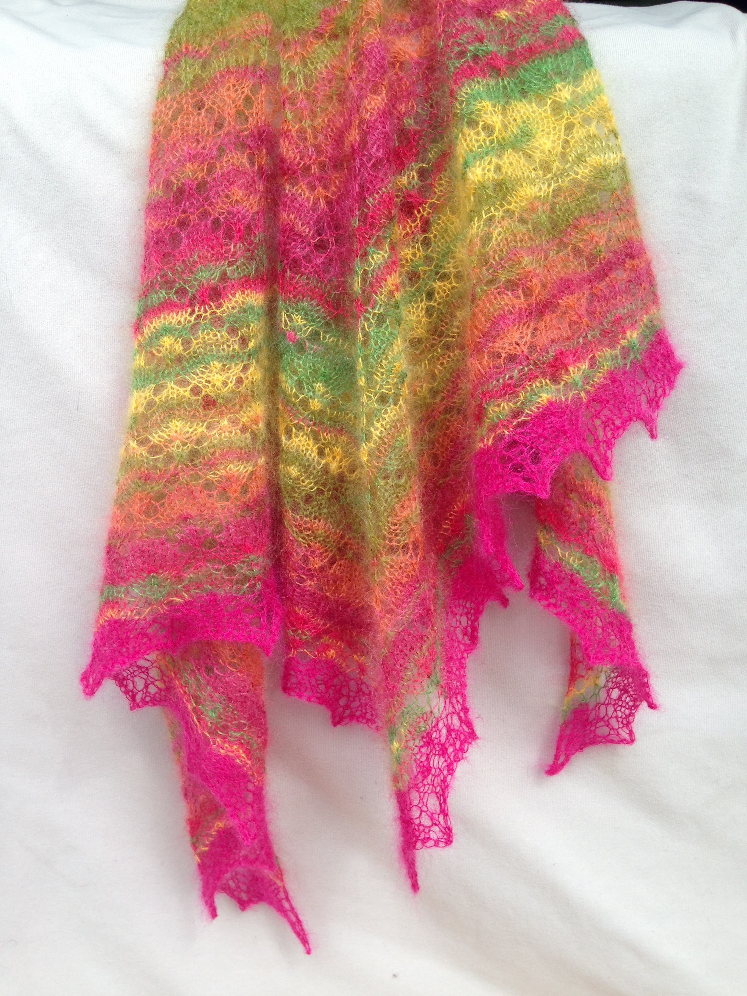 I frogged it back to the beginning twice before mastering the pattern – not an easy task with mohair as it welds itself strand to strand immediately.