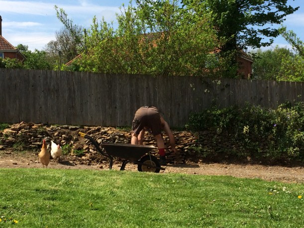 15. The husband had company from the hens as he made further progress on rebuilding the wall that they have systematically destroyed over the years.
