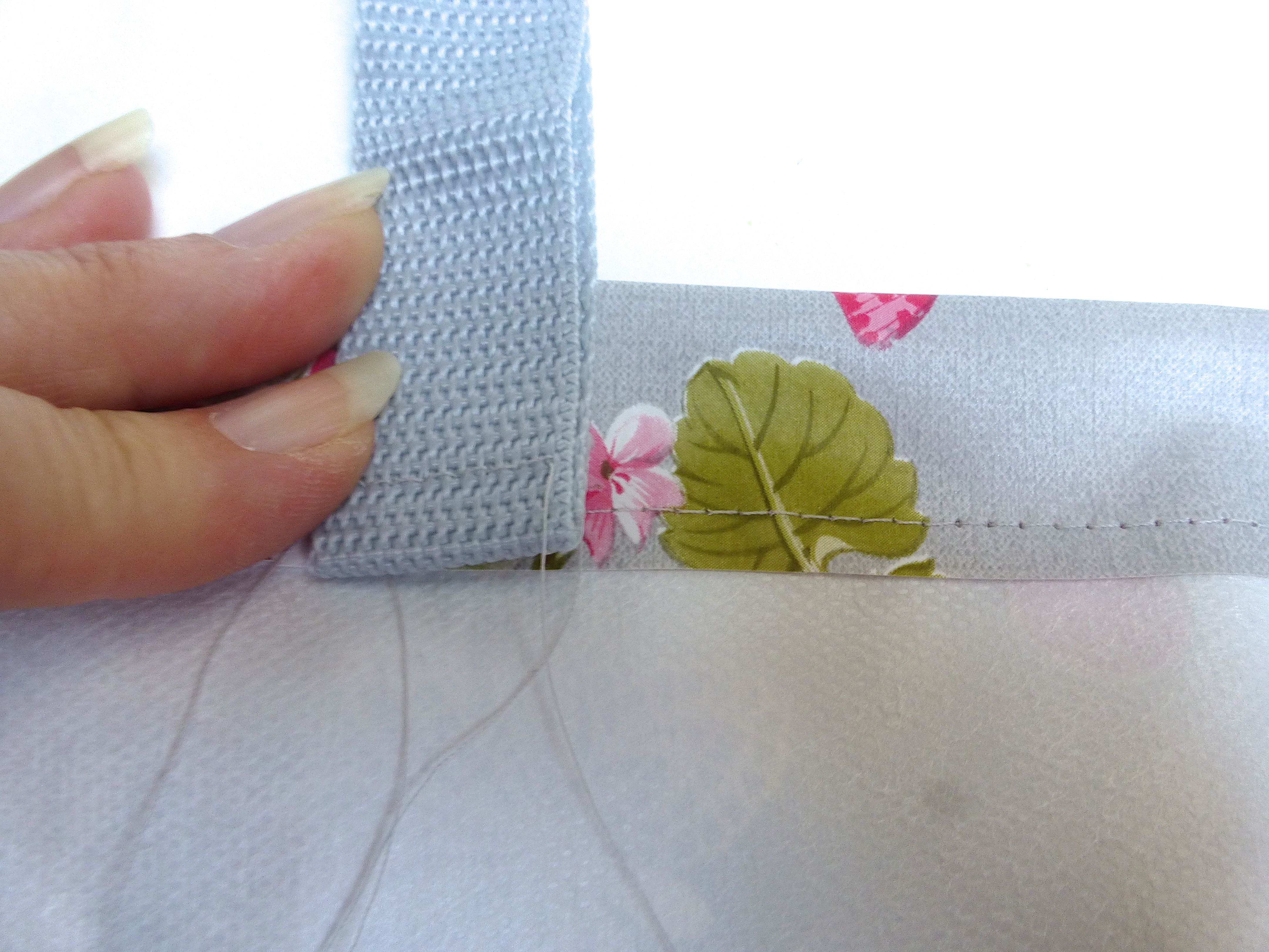 With the raw edges of the handles facing the wrong side of the bag, stitch in place 32cm in from each side seam.
