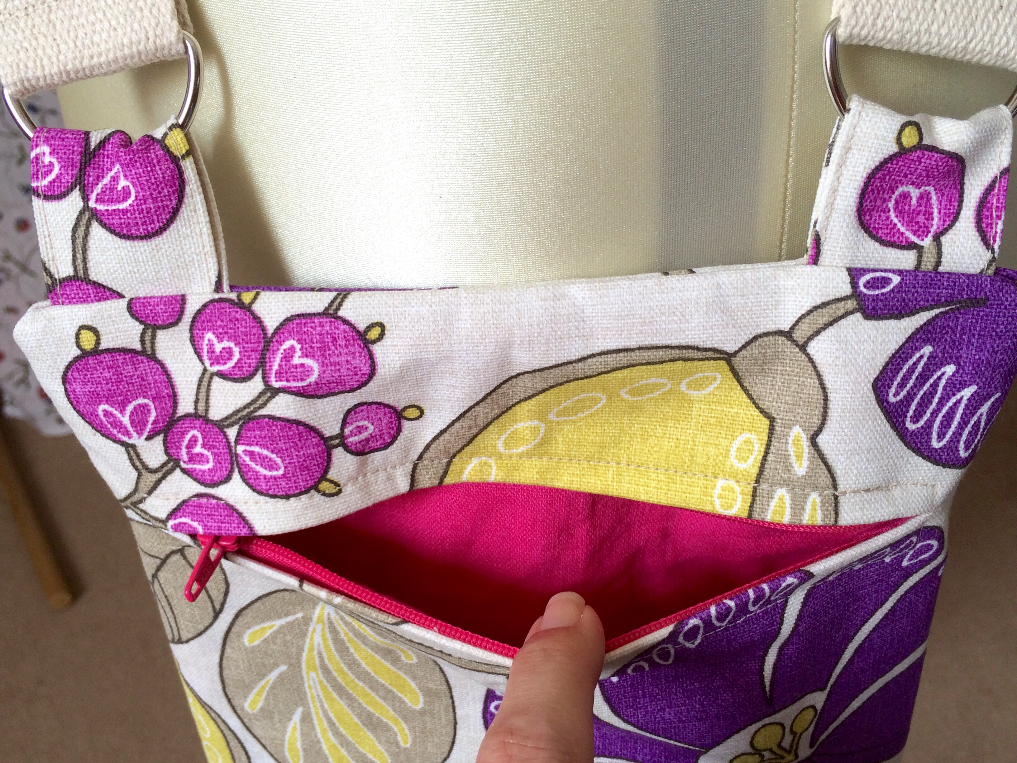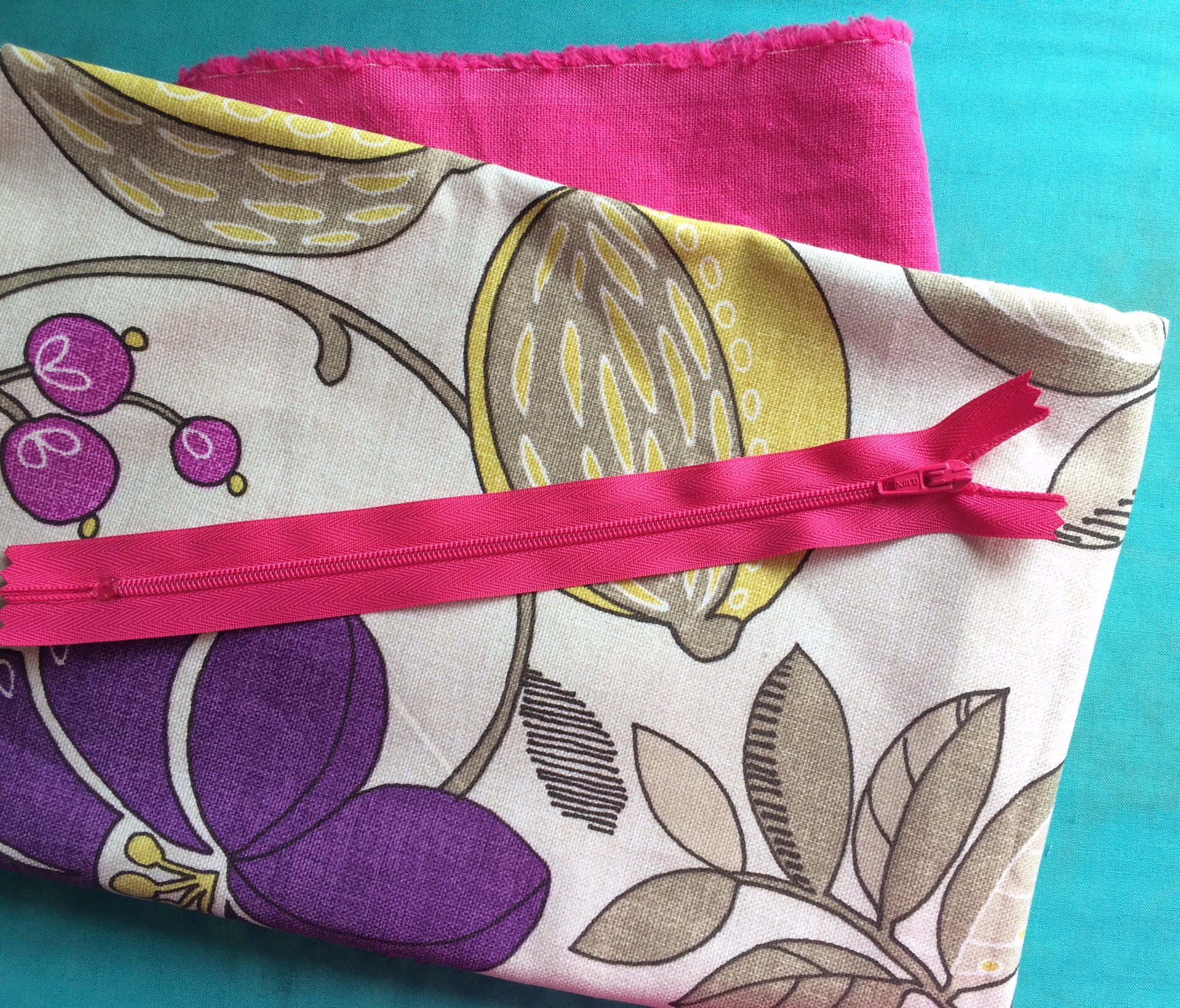 I found some canvas-like fabric in my stash that I bought on a whim ages ago that was waiting for the right project. The bold pattern was crying out for a contrasting lining, so I used up the last of my fuchsia linen and chose a matching zip.