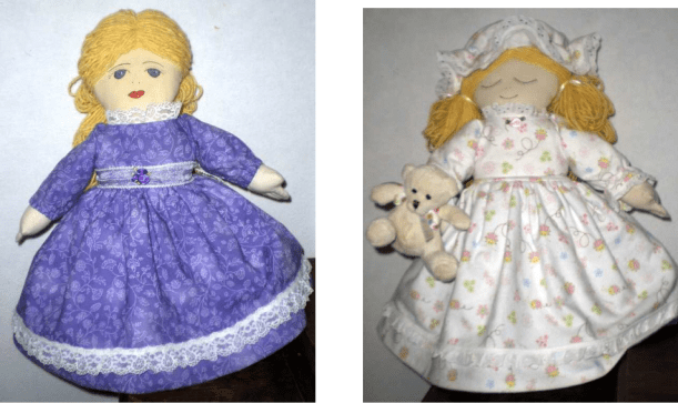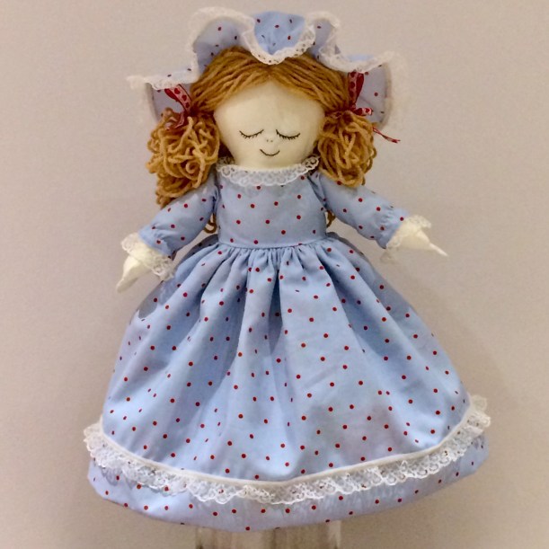 I found a free tutorial at Keepsake Crafts and pretty much followed it to the letter. This is her version, a daytime/bedtime doll: –