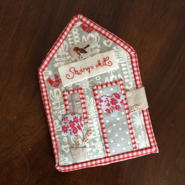 A little robin perches on the sign above the door which, instead of the house name, says “Sewing Kit”.
