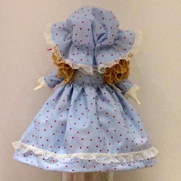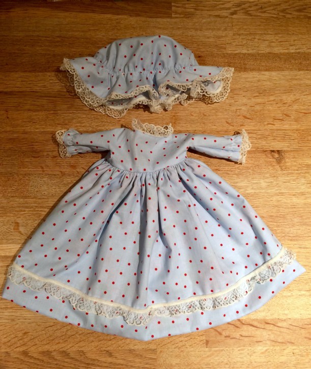I used coordinating fabrics for each dress, originally from Ikea, I think; floral for the day dress and spotted for the nightgown and cap.