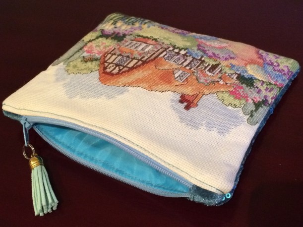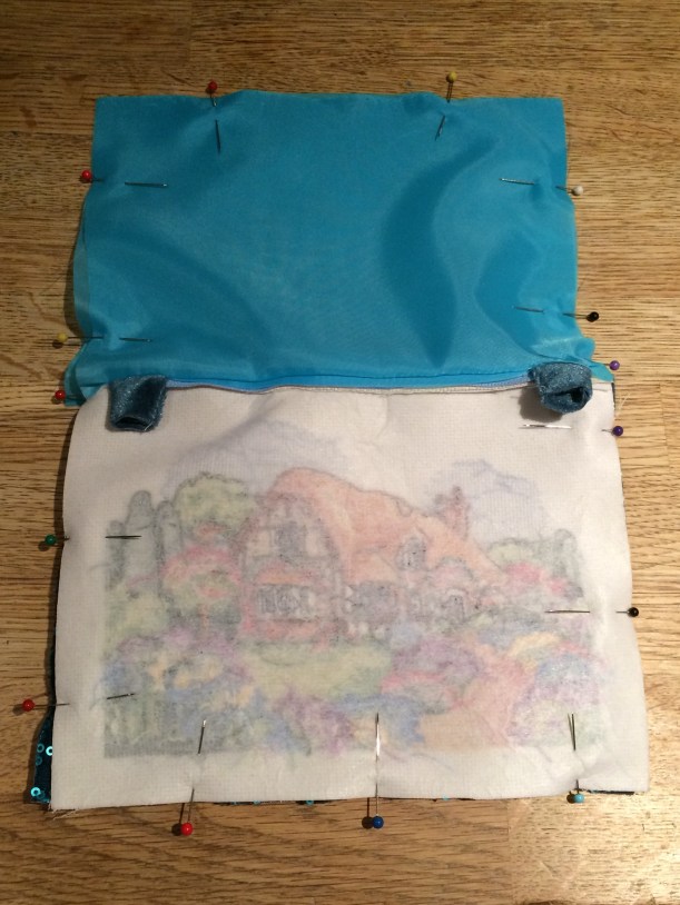 I decided to make a zipped pouch, about the size of a cosmetic bag, which could have a variety of different uses. Maybe for a portable cross stitch project, a small crochet or knitting project, or maybe as an actual cosmetic bag – it is rather swanky, after all!