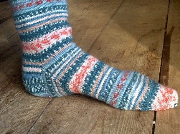 These have been an absolute joy to knit from start to almost-finish, after a little hiccup where I ran out of yarn and had to buy a whole new skein just to finish the toe. I love them and they’re my fourth pair – I plan to have only handknit socks in my drawer by the end of the year.