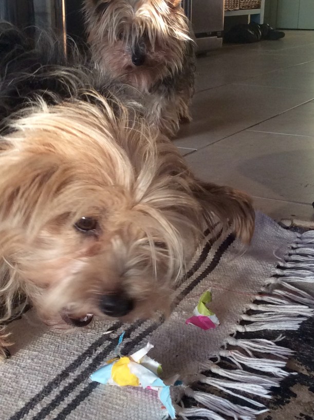 5. It’s impossible to get a decent photo of your dog enthusiastically tearing open her birthday present, but here is Tess on her third birthday with Fifi looking on enviously in the background.
