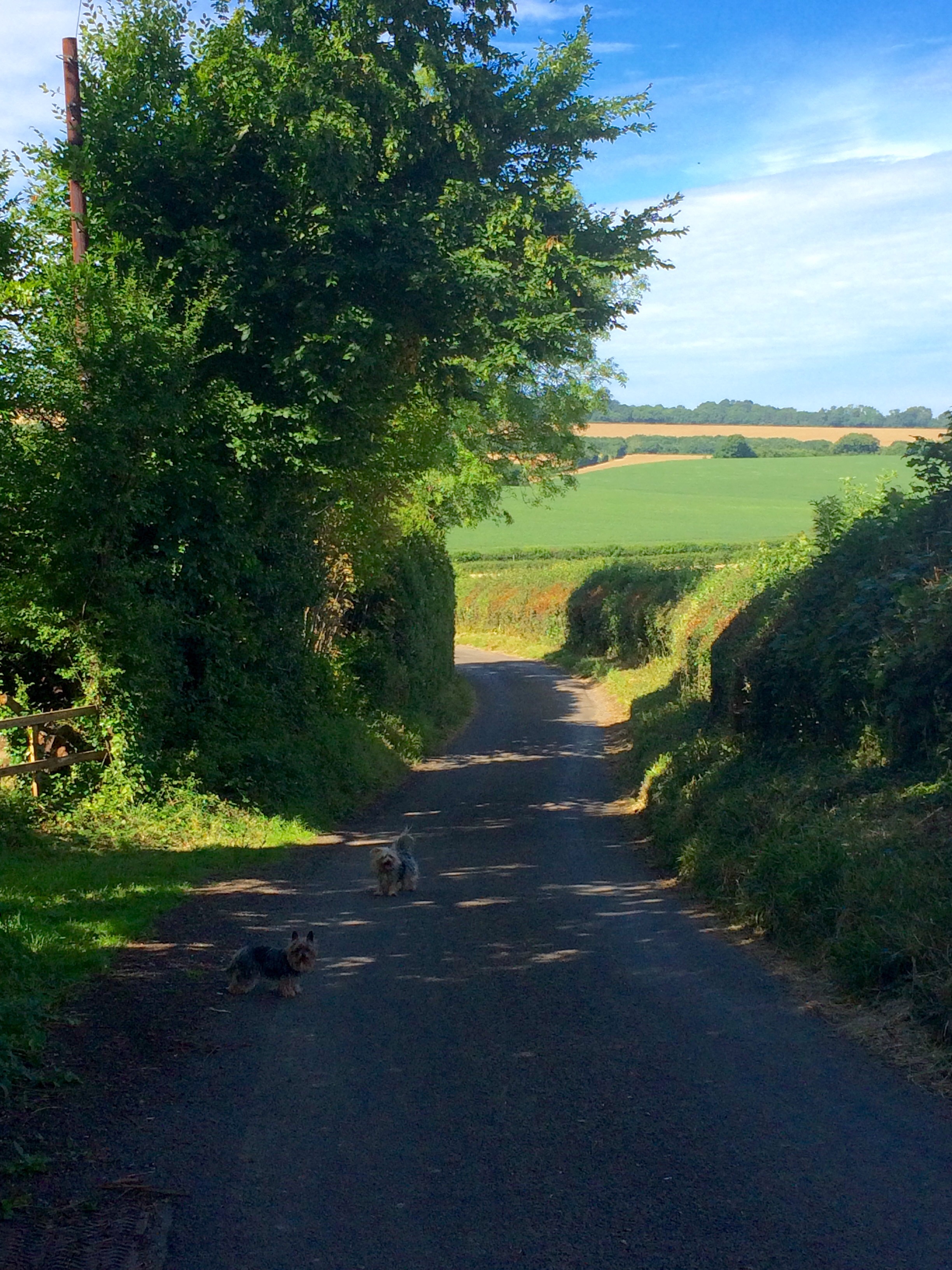 2. If you look carefully in the shadows, you can just about make out Fifi and Tess wondering why I suddenly stopped. I thought I’d take a few photos of our usual five-mile route, beginning with open fields and country lanes which are always traffic-free apart from the odd farm vehicle or post van.