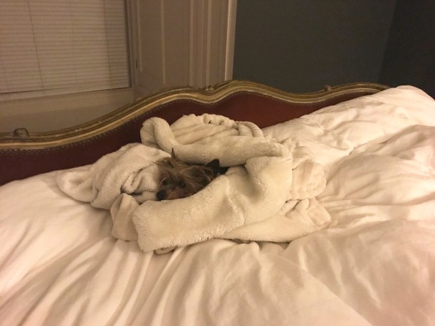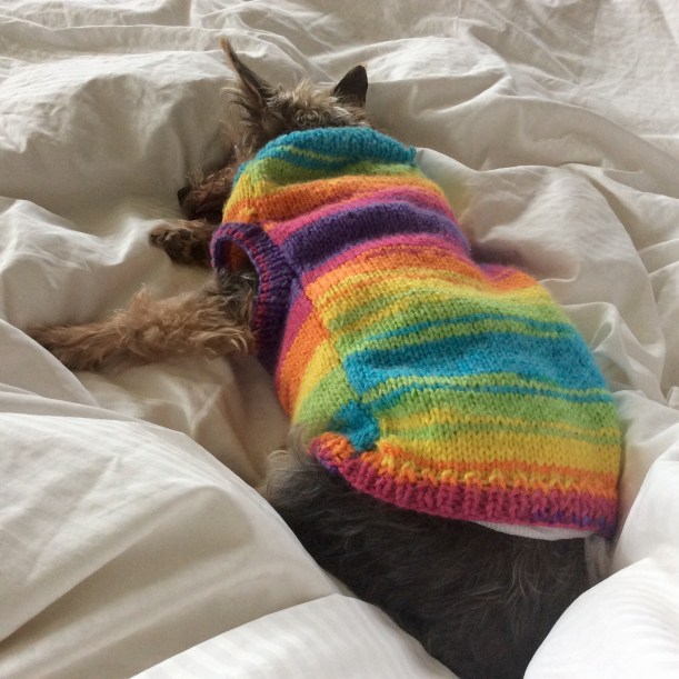 She’s lying on the bed beside me whilst I type this, snoring quite contentedly wrapped in bandages and her little rainbow coat.