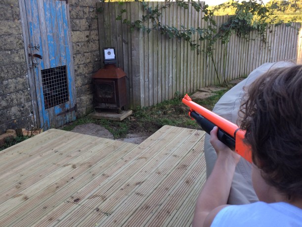 4. No.3 Son did some target practice with the BB gun under Daddy’s supervision. Note the newly pruned back blackberry bush:)